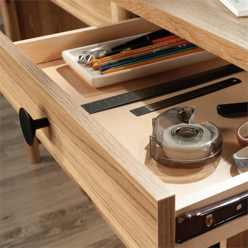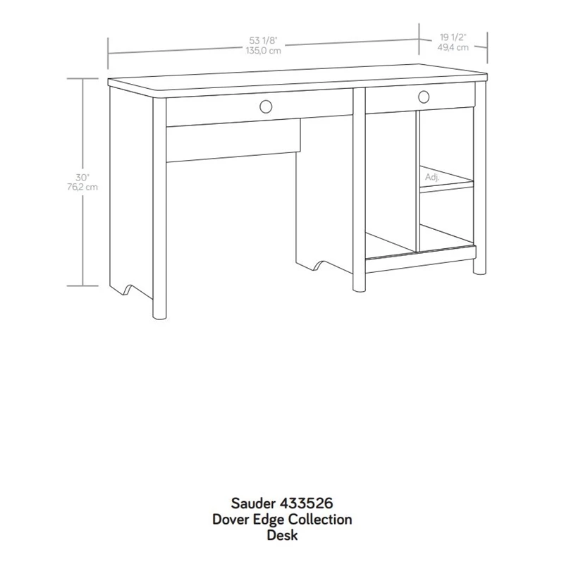 Give your home workspace a fresh new look with this home office computer desk from the Dover Edge™ collection. The spacious desk top surface of this computer desk with drawers provides you with ample room for all your must-have desk essentials – your collection of notepads, a cup full of pens and even an accent lamp. Two convenient storage drawers with metal runners and safety stops are useful for storing your planner, laptop, and other miscellaneous items. For kids, these drawers are perfect for coloring books, crayons, or other activity accessories. A dedicated storage space for a vertical CPU tower makes this computer desk with shelving ideal for the aspiring gamer: Beat the latest boss from the comfort of this computer desk with storage. An open storage cubby area with an adjustable shelf allows for versatile storage options. Finished in Timber Oak™, this home office desk with storage makes working from home, or writing your to-do list, stylish and practical.