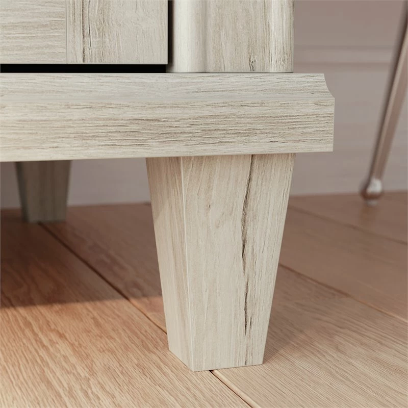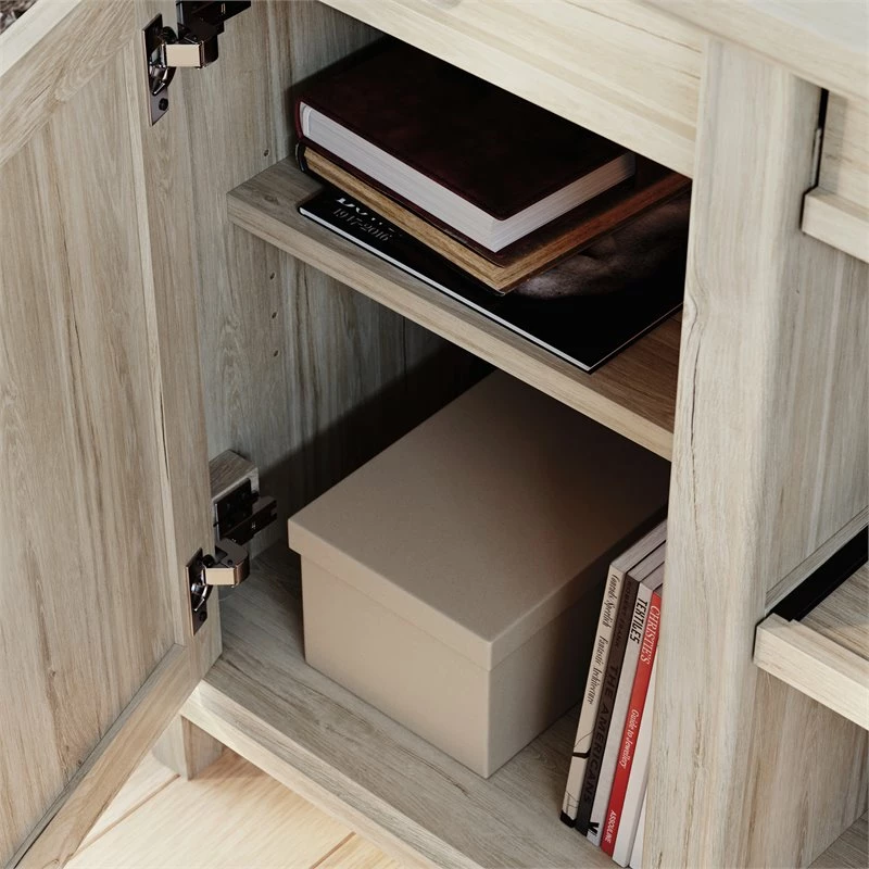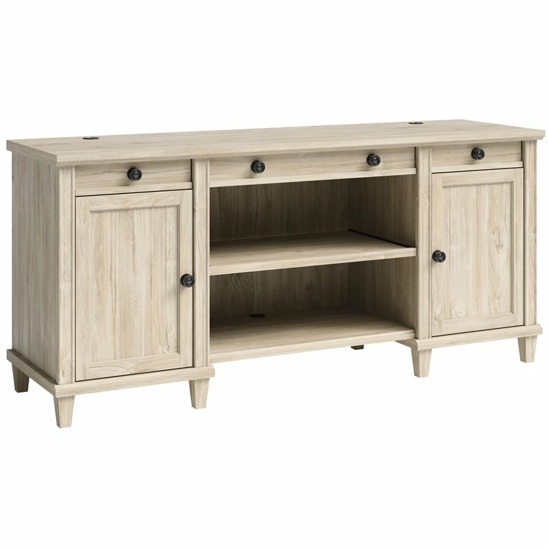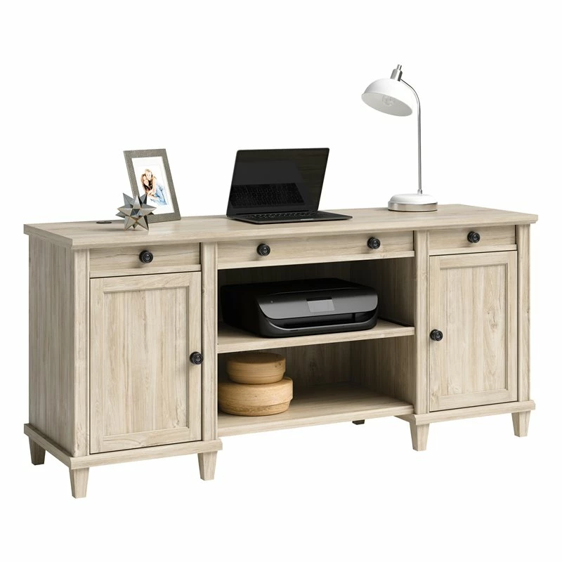 A home office credenza adds display and storage space in one stylish accent piece. The office credenza from the Hammond® collection complements the pieces you already own while adding a touch of fresh style into your home. With a durable, 1″ thick top this double pedestal credenza has a top surface you can use to display pictures of your loved ones, pieces of home décor that make the office feel like “home,” and of course, essential office supplies like a lamp or binders. All three drawers of this wood storage credenza feature full extension slides for ease of use. Behind each door is an adjustable shelf so you can customize your credenza to accommodate your items of various heights. A pull-out, adjustable printer shelf means that your printer is always close by and has no need to be tucked away in a storage cabinet. This credenza desk features a cord management system that includes two desktop grommet holes to keep your electrical cords organized and out of sight. With solid wood feet detailing and a Chalk Oak finish, this wood storage credenza adds style and much needed storage to any room it’s in.