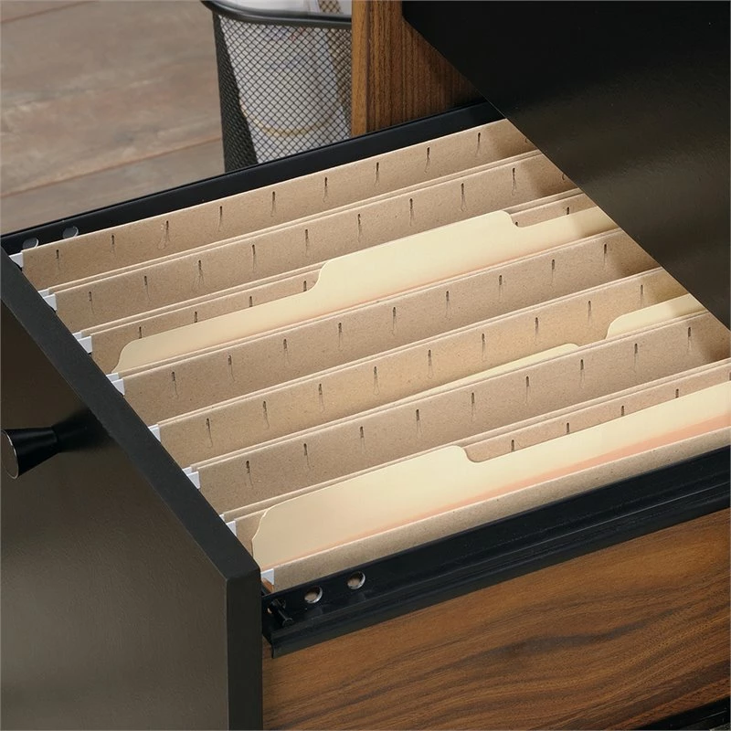 Working from home never looked better. This desk from the Harvey Park® collection is everything you need to get the job done. This modern home office desk features a spacious work surface that provides plenty of room for all your office essentials – laptop, folders, and of course, your coffee mug. This metal and wood office desk features an adjustable shelf behind the door for customizable storage options. A fixed shelf on the right side as well as a pencil drawer, and two storage drawers make storing your paper, folders, binders, sticky notes, and more, as easy as possible. The lower storage drawer holds letter-sized files for all your important documents, so they can stay organized and easy to find. The storage options are endless! Finished in Grand Walnut® with a black powder coated metal base, this modern desk with file drawer is ready to work for you.