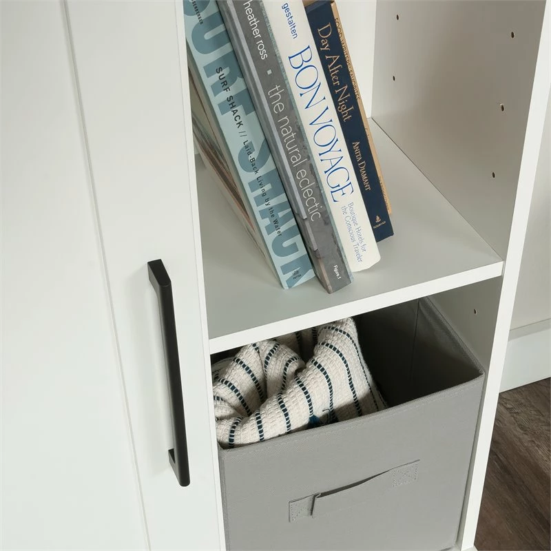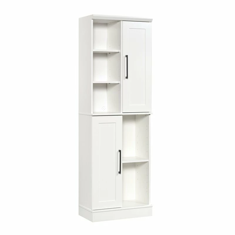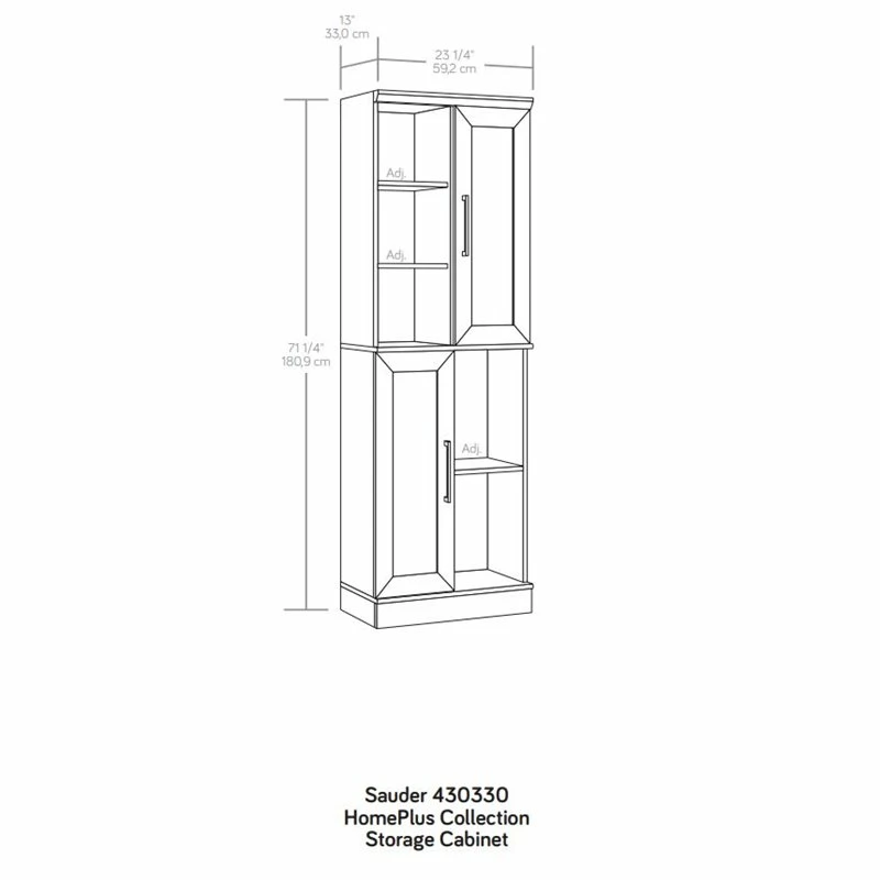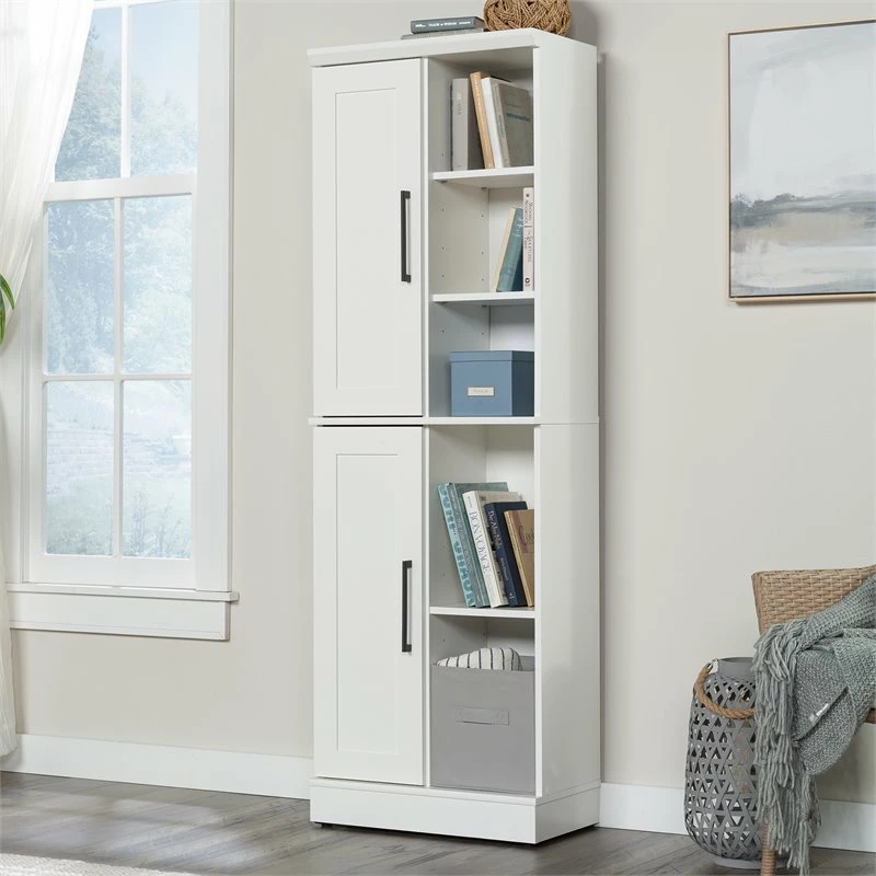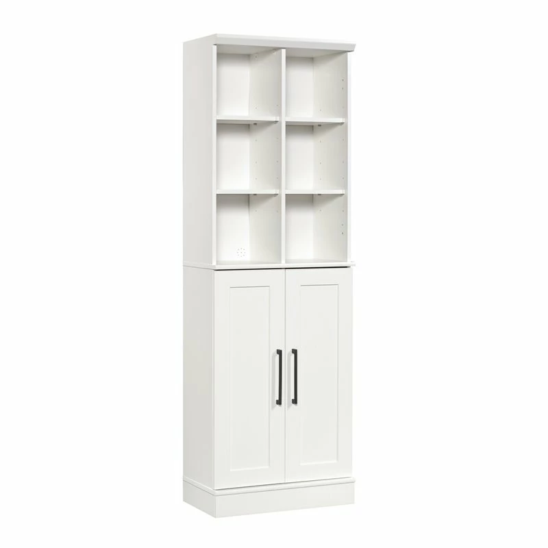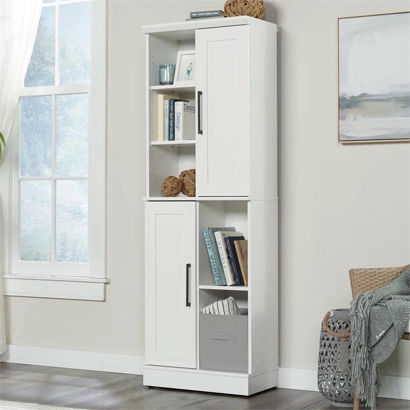 Configurable shelving to fit your specific storage needs. This 2-door storage cabinet from the HomePlus collection allows for a customizable design—allowing you to position the framed panel doors on either the top or bottom, left or right. You can create hidden storage areas in the exact cubbies you want covered up. This kitchen storage cabinet features six adjustable shelves to accommodate items of various sizes like boxes of cereal, canned food, or other pantry staples. For use in other parts of your home, this modern storage cabinet features an enclosed back panel with cord access, making it easy to charge your phone, tablet, smart watch, and more. Store books, board games, bathroom essentials, or candles on the interchangeable shelves. This white storage cabinet features adjustable base levelers, so your cabinet will be level even if the floor is not. Finished in Soft White®, this pantry storage cabinet is built for your home.