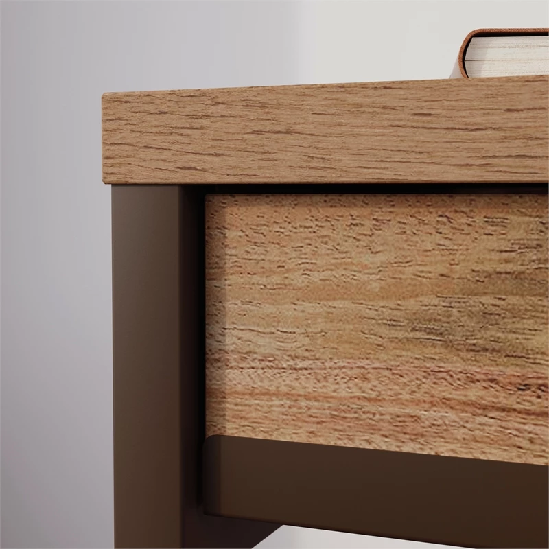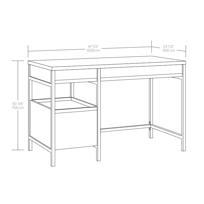 A small addition to your home office that packs a big punch. This home office desk from the Manhattan Gate® collection features three storage drawers, with two smaller drawers with metal runners and safety stops that conveniently store your favorite pencils, planner, to-do list and other desk supplies. The top surface of this desk with open shelving has enough room for your computer or laptop, a décor lamp, your cup of pens, and more. The open storage space in this computer desk with drawers keeps your sticky notes, binders, books, and more at the ready whenever you need them. A lower file drawer with full extension slides holds your most important letter-size hanging files, keeping them organized and easy to find. This metal and wood desk is finished on all sides for versatile placement, ensuring that it will look polished from every angle. Finished in Sindoori Mango® with a powder coated metal frame, this single pedestal desk evokes casual refinement in your home office.