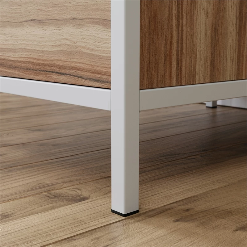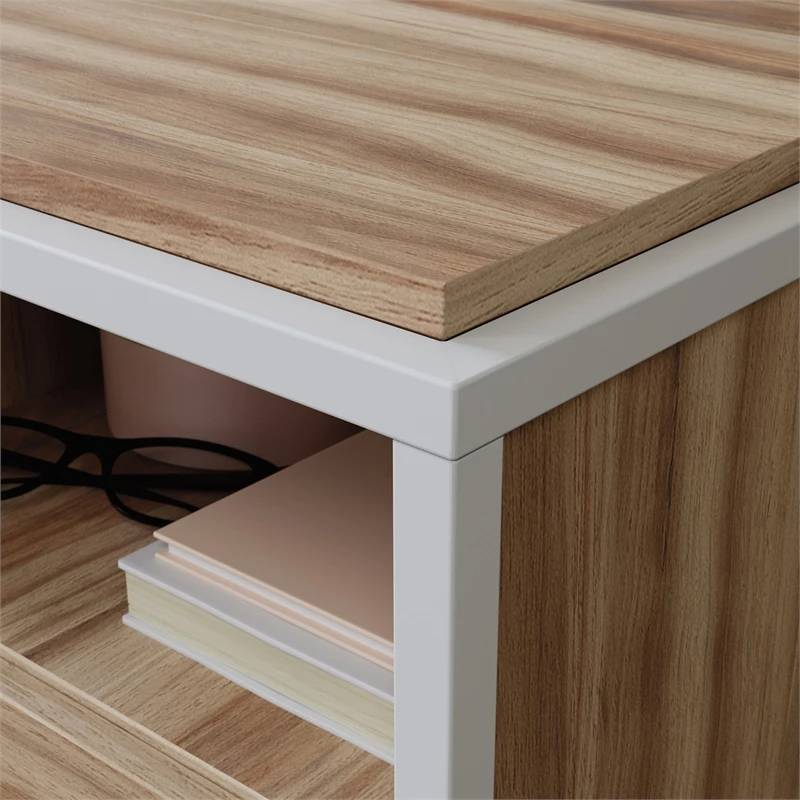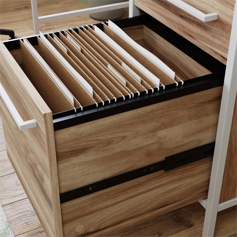 A light and airy aesthetic keeps a home office fresh and the ideas flowing. This home office desk with drawers from the Nova Loft® collection is stylish and storage friendly. This metal and wood desk features a spacious tabletop that provides you with room for all your office essentials – a computer monitor or laptop, your cup of pens and pencils, and colorful sticky notes. This pedestal desk features a small drawer with metal runners and safety stops for a stapler, planner, and other things you need to keep stowed away. The small storage cubby beneath the top surface offers a space for office supplies you want out of the way but close at hand. The lower drawer opens on full extension slides and holds letter-size hanging files. This home office desk with storage is finished on all sides for versatile placement in any room of your home. The finishing touch of a powder coated metal frame sets this desk apart. Finished in a Kiln Acacia™, this practical computer desk with shelving is just what you need to get the job done.