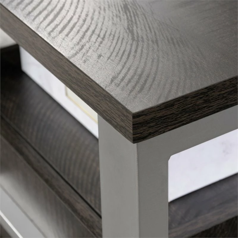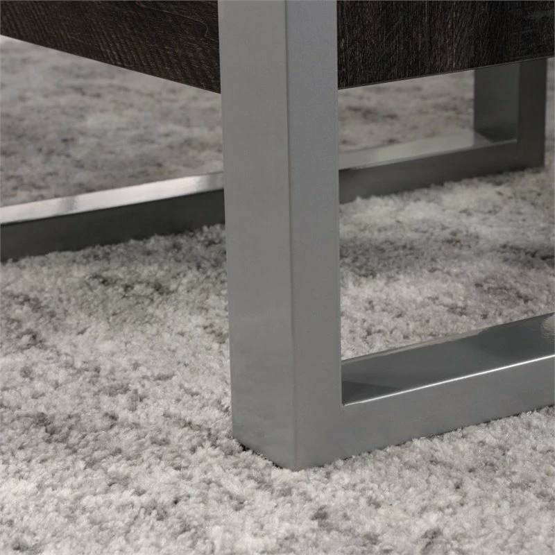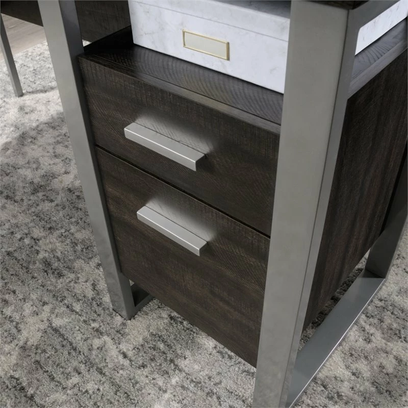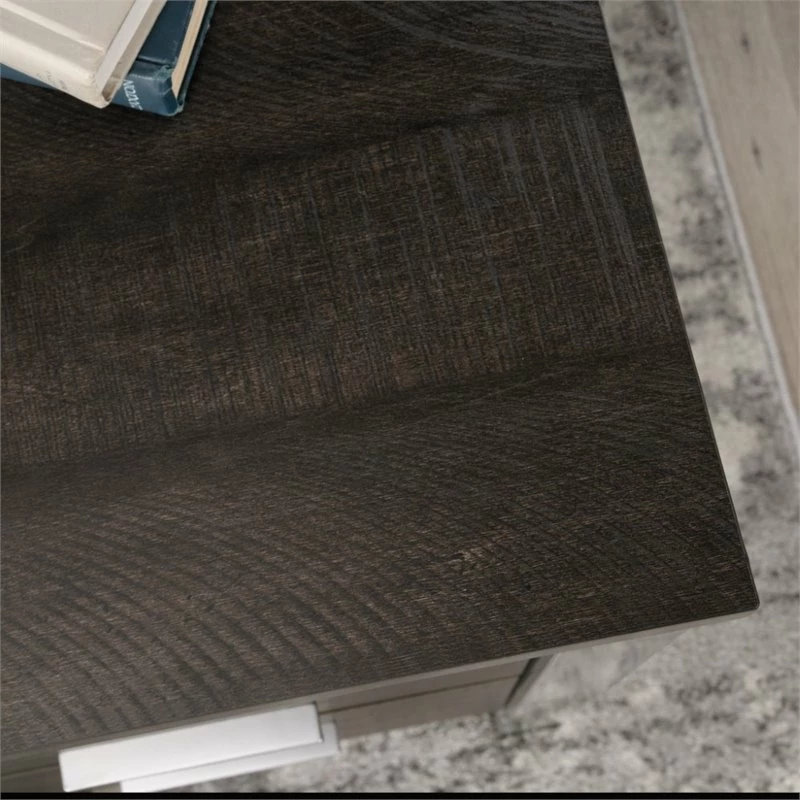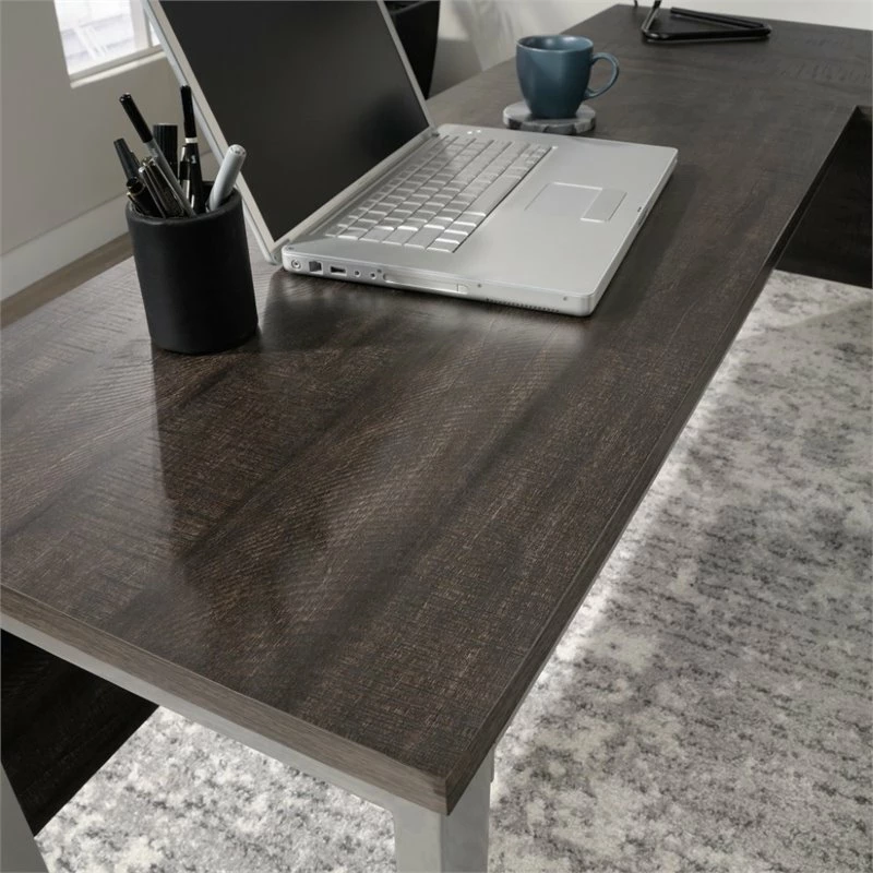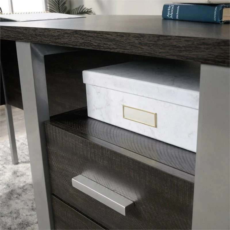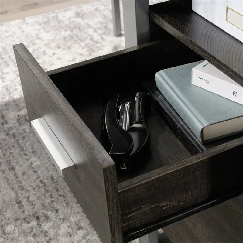 It’s time to give your office space the update it deserves! Create the perfect spot to work on all your big projects all while adding a beautiful touch of style and design with this L-shaped desk from the Rock Glen collection. This home office desk offers a spacious top surface that provides you with all the room your need for your office essentials like a laptop, telephone, work folders, and your hot cup of coffee. There’s also plenty of space for home décor items like an accent lamp and framed photos too. The small storage drawer opens and closes on smooth metal runners for easy access storage of miscellaneous items like envelopes and rubber bands. The lower drawer with full extension slides can hold letter-size hanging files for increased organization. Need more storage? There’s also an open shelf for convenient access of papers and supplies. Other features include a silver finish, powder coated metal frame and a lightweight 1” construction top. Finished on all sides in Blade Walnut™ so it can be placed anywhere in the room, this handsome desk will have your office looking top notch.