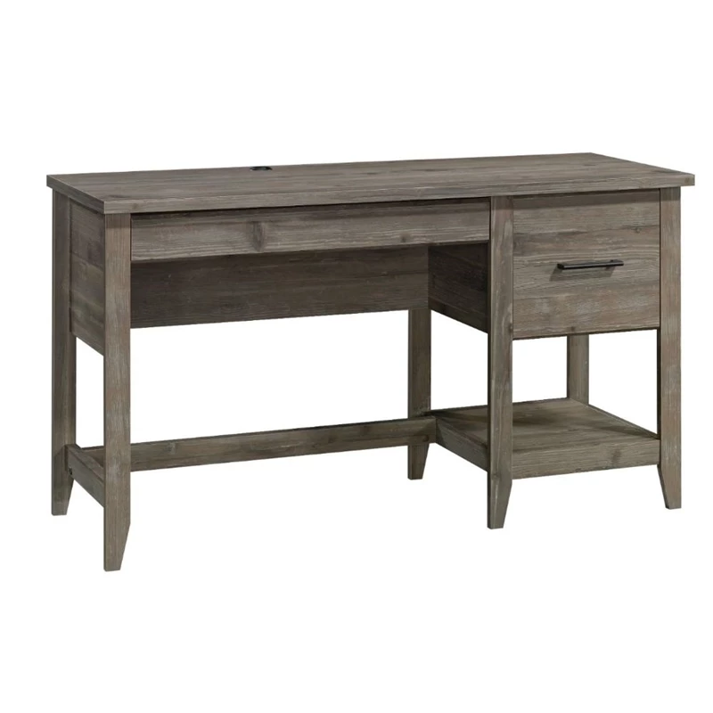 Spacious but compact and stylish without being flashy—This desk from the Summit Station® collection adds visual intrigue and unique storage to your home office, bedroom, or living room. This single pedestal desk offers a spacious top surface that provides you with space for items like your coffee cup, jar of pens, photos of your family, and planner. This computer desk with storage features two drawers that open and close on smooth metal runners for easy access to your pens, charging cords, sticky notes, and more. The file drawer holds letter-size hanging files for extra organization. The lower open shelf provides you with additional storage space for miscellaneous items like organizing bins and home décor. A desk-top grommet hole for electrical cord access means that cord clutter is a thing of the past. This single pedestal desk with filing drawer features a strong and lightweight panel construction and is detailed with tapered feet and chamfered edges. Finished on all sides in Pebble Pine™ this small office desk offers a lot, in a small package.