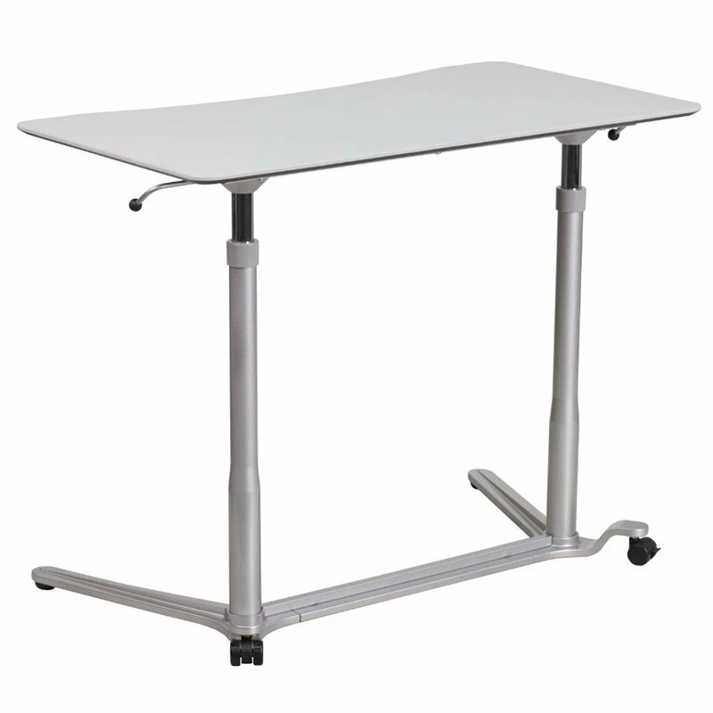 A healthier way of working with this contemporary, versatile computer desk. We all know that sitting for hours is an unhealthy practice, but with long workdays it has become more common. Standing helps strengthen leg muscles, improves your balance and promotes healthy blood flow. Standing even burns more calories than sitting. This desk gives you the option to sit down or stand up. The pneumatic lever allows you to easily adjust the height with minimal effort. When preparing to work you should adjust the desk so the surface is at the most comfortable position for typing. The large surface make this desk suitable for laptop and desktop usage. Since desktops are heavier than laptops, front adjustable glides were added to the front of the desk, while locking glides are added to the back legs, making this desk essentially mobile.