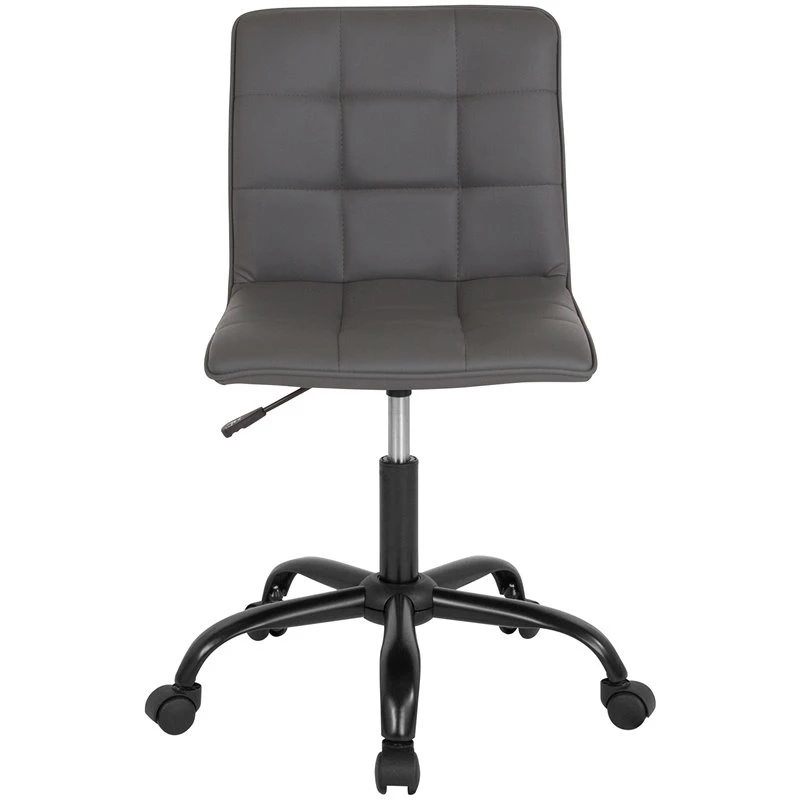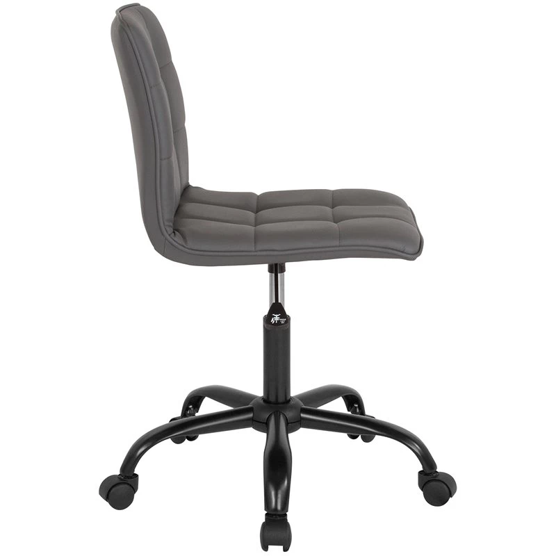 This functional chair has beauty and style and would be a complement to your home or office. This gray Leathersoft upholstered task chair is adjustable and comfortable, with sumptuous tufted padding in the seat and back. Leathersoft is leather and polyurethane for added softness and durability. Chair rotates 360 degrees to provide easy access to a greater range of area. A pneumatic seat height adjustment lever lets you easily position the chair at a height that is most comfortable for you. The dark frame and casters create a contrasting detail that is sure to be noticed. This fashionable task chair will make a great addition, whether it is the focal point or an attractive accent.