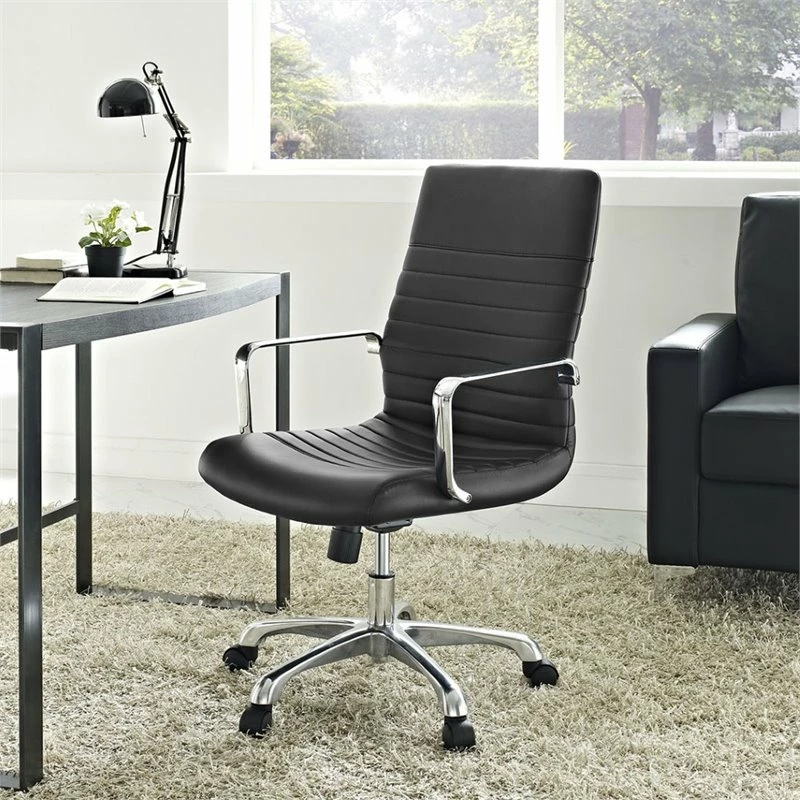 Sweet precision and simple details go into making a pleasantly rewarding office chair. Designed with a delicately ribbed vinyl cushioned high back and waterfall seat, the chair delivers a touch of everything that matters. Equipped with polished aluminum arms, and a hooded nylon base with five dual-wheeled black casters, easily glide over carpeted surfaces in style.