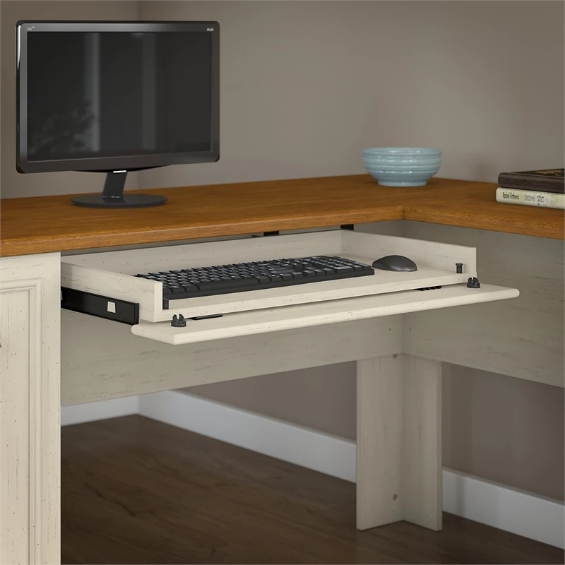 Bring a slice of cottage comfort into your home office with the Scranton & Co L Shaped Desk. Enjoy your morning coffee, surf the net and pay bills with plenty of room to spare on the L Shaped Desk’s durable surface. Stash pens, paper and checkbooks in the box drawer and open storage space, while organizing mail in the file drawer to clear the work surface. Store your laptop or keyboard in a drawer with a drop-down front, and take advantage of a large vertical closed storage area with an adjustable shelf. Charming accents and Antique Pewter hardware add character to your home office. Attach the Hutch (sold separately) to either side of the L Shaped Desk to fit your needs. Available in attractive Antique Black with Hansen Cherry Accents or Antique White with Tea Maple Accents, Scranton & Co meets ANSI/SOHO quality test standards for performance and safety, and comes with a Scranton & Co 6 Year Manufacturer’s Warranty. See the full collection for coordinating items available, including the Hutch.