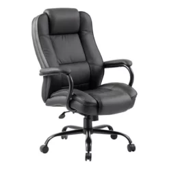 350 lb. weight capacity. Upholstered in Black LeatherPlus. LeatherPlus is leather and polyurethane for added softness and durability. Padded arms incorporated into steel wrap around style construction. Reinforced lumbar. Heavy duty spring tilt mechanism. Pneumatic gas lift seat height adjustment. 27″ brushed metal base. Large heavy duty casters.