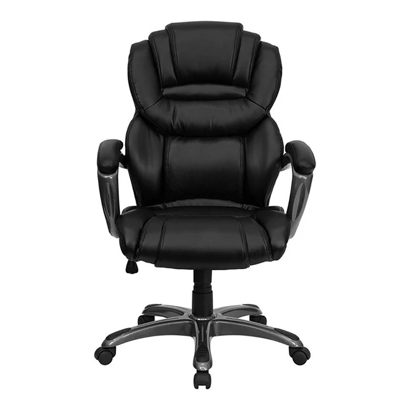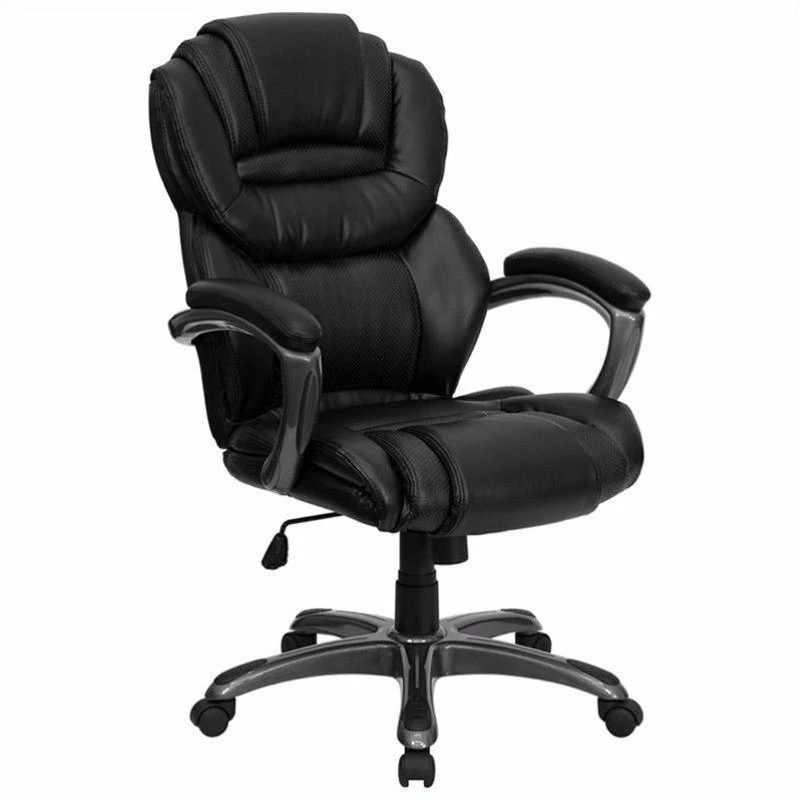This popular contemporary office chair features soft Leathersoft upholstery, an overstuffed seat, back and arms, and ergonomic styling to provide an unmatched sitting experience. Leathersoft is leather and polyurethane for softness and durability. High back office chairs have backs extending to the upper back for greater support. The high back design relieves tension in the lower back, preventing long term strain. The waterfall front seat edge removes pressure from the lower legs and improves circulation. Chair easily swivels 360 degrees to get the maximum use of your workspace without strain. The pneumatic adjustment lever will allow you to easily adjust the seat to your desired height. The titanium nylon base with black caps prevents feet from slipping when resting on chairs base. For your next office chair, look no further than this comfortable and very stylish Leathersoft office chair!