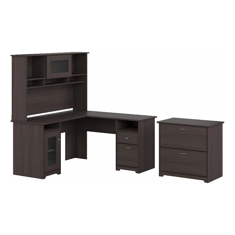 Work in style with the Scranton & Co Furniture Cabot L Shaped Desk with Hutch and Lateral File Cabinet. Enjoy a traditional look with smart features. The L Shaped Desk provides a large durable work surface and storage, including an enclosed cabinet with stylish fluted glass door, a box drawer for supplies and a file drawer. A 4-port USB hub adds convenience. Hutch boasts a matching fluted glass door, large open compartments and four work-in-process areas, along with a cable management system to control cords. Lateral File Cabinet has two spacious drawers gliding on smooth full-extension ball bearing slides. Chrome-finished hardware completes the timeless design. Backed by a 1 Year Warranty. See the full collection for coordinating items.