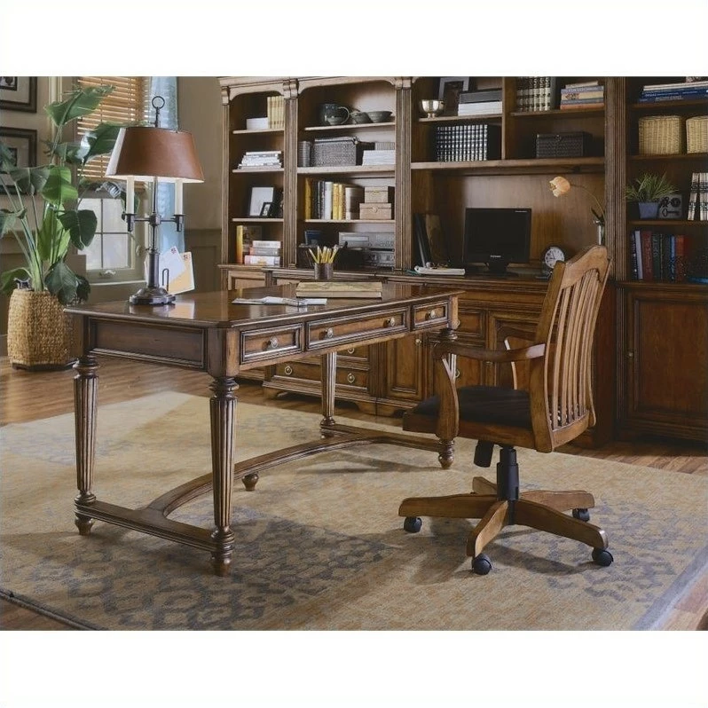 The Scranton & Co Tilt Swivel Chair supports your best work with timeless design details like a wood-slat back, shaped and carved arms and wood trim in cherry veneers in a distressed medium clear finish. For comfort and versatility, the Scranton & Co desk chair has a durable, cleanable vinyl seat, is on casters, tilts and swivels and has a pneumatic lift for adjustable seat height.