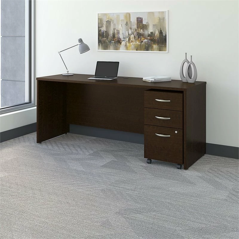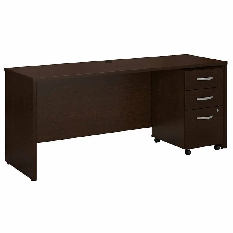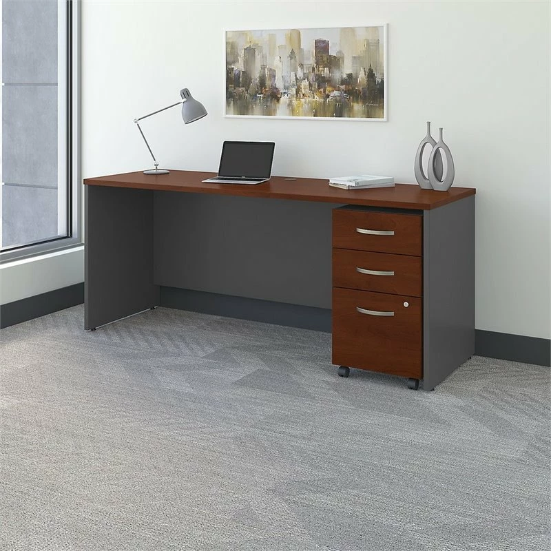 Make the most of your workspace with the Bush Business Furniture Series C 72W x 24D Office Desk and Mobile File Cabinet. The professional-grade quality means you get a roomy, thermally fused laminate surface, sturdy construction and durable edge banding for reliable long-term use. At 72W x 24D, the Office Desk provides plenty of room to spread out without taking up much floor space. Extended modesty panels, clean lines and Brushed Nickel hardware enhance the professional appearance. Featuring a lock for your security, box drawers for office supplies and a full-extension file drawer, the Mobile File Cabinet effortlessly rolls across your floor. The options are endless with Series C. This affordable commercial office furniture boasts quality craftsmanship, user-friendly features and 7 stylish finishes to blend seamlessly in any environment. Multiple layout options meet the needs of numerous workspaces, from the private or home office to reception areas and conference rooms. Affordably priced but built to last, this furniture withstands the rigors of a 40-plus hour week. Series C evolves with your preferences, allowing you to reconfigure your workspace as required with a complete line of coordinated products and accessories.