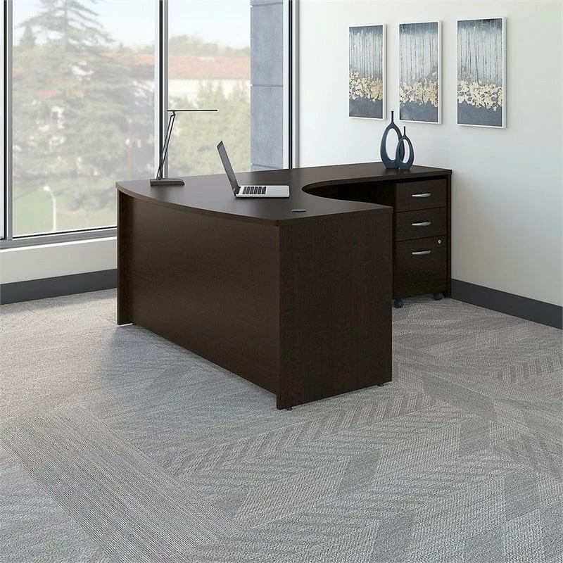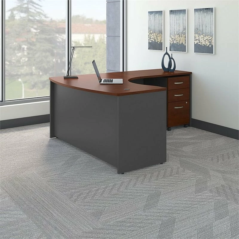 Work with the convenience you want and the durability you need. This Bush Business Furniture Series C Right Handed L Shaped Desk makes the most of your office space with a clever construction and user-friendly features. Attractive and inviting, the Bow Front design gives guests the space they need to pull up chairs, meet and collaborate. Spread out on the expansive L Shaped Desk and feed your cables through wire management grommets in the surface to keep them concealed and out of your way. The thermally fused laminate finish and sturdy construction provide long-lasting professional quality, while extended modesty panels and Brushed Nickel hardware make an impressive statement. Guide the Mobile File Cabinet throughout your office or store it under the L Shaped Desk to conserve floor space. Enjoy easy access to paperwork with a full-extension file drawer gliding on smooth ball bearing slides. The options are endless with Series C. Backed by quality craftsmanship and a 10 Year Warranty, the collection withstands the rigors of a 40-plus hour week. Multiple layout options and 7 finishes meet the needs of numerous workspaces. Series C evolves with your preferences, allowing you to reconfigure your office as required with a complete line of coordinated products.
