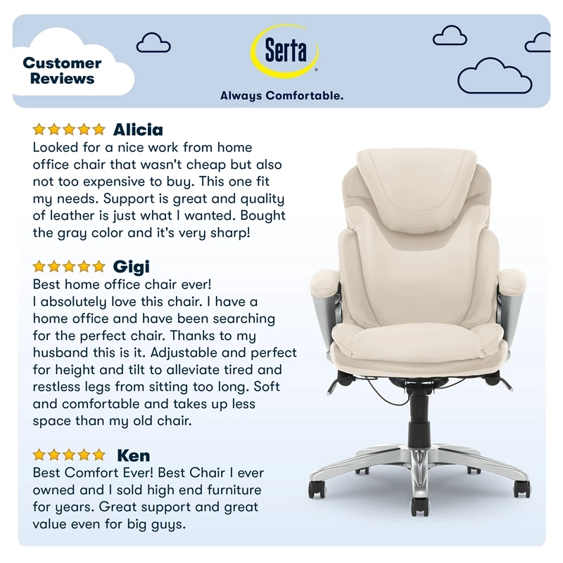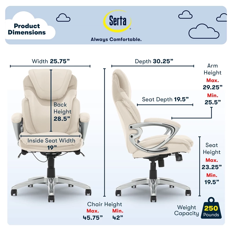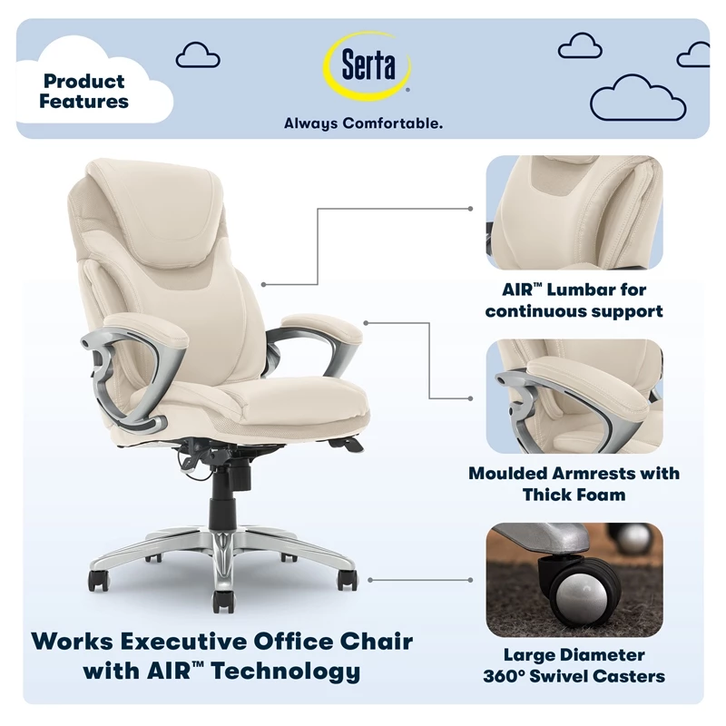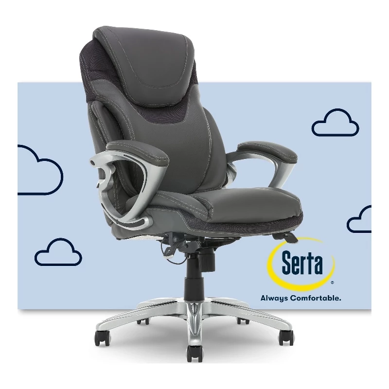The Serta Bryce Executive Office Chair effectively responds to your movement to keep you comfortable all day long. This ergonomic office chair comes with AIR Lumbar Technology, a support feature that flexes and pivots with your body as you lean and twist to ensure proper posture. Layered body pillows and padded armrests provide a serene and tranquil seating experience. The perforated center area of the seatback adds refreshing breathability, and ergonomic seat-side levers offer convenient height and tilt adjustments. This desk chair is upholstered in soft, supple bonded leather and features contrast stitching for a stylish touch.
