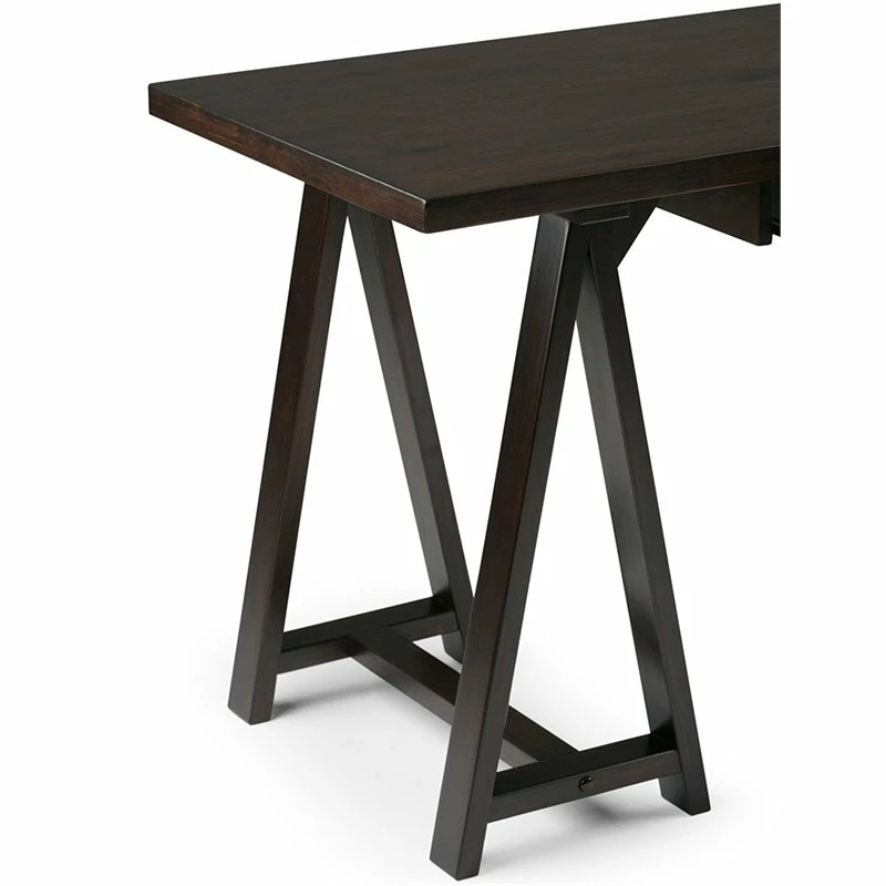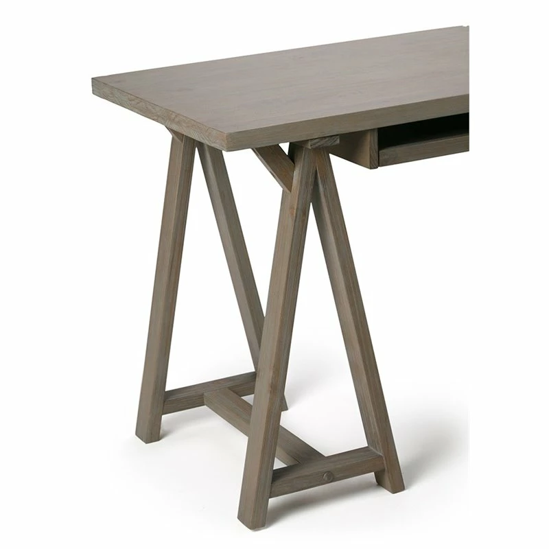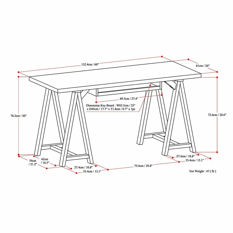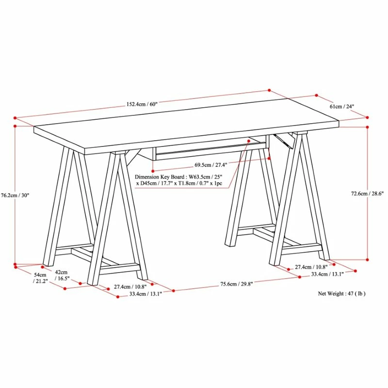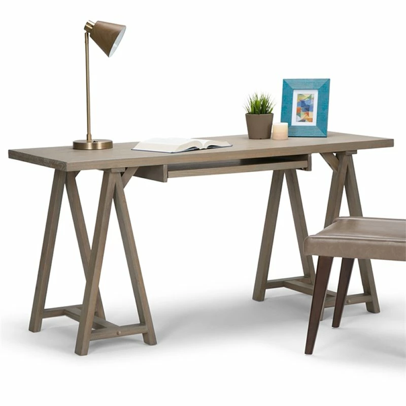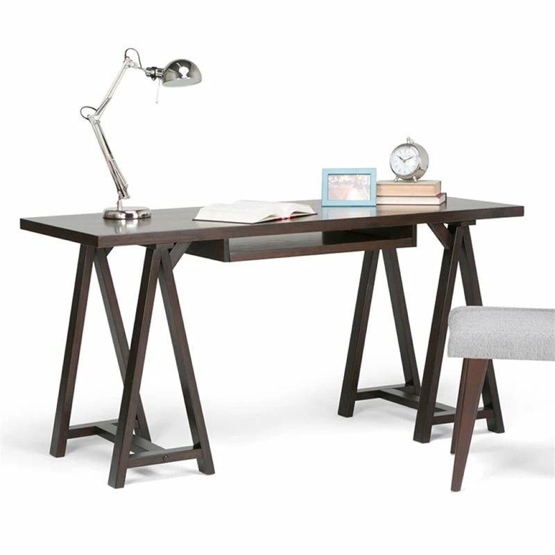 - Features a simple and wide, extra thick table top surface, integrated wood keyboard tray and sturdy sawhorse supports