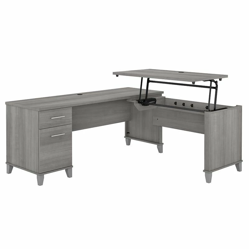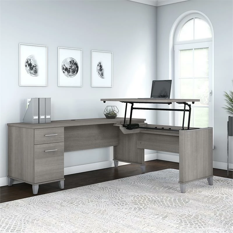 Upgrade your personal workspace with the ergonomic Bush Furniture Somerset 72W 3 Position Sit to Stand L Shaped Desk. As a quality alternative to desktop risers, the innovative 42W x 24D Sit to Stand Return offers all the health benefits of a standing desk with the versatility of more expensive electric height adjustable options. The built-in mechanical Lift-n-Lock system allows the desktop to lock into place at standing heights of 35, 38, and 41 inches and easily returns to a seated position. The 72W x 24D Office Desk includes a file drawer that opens on full-extension ball bearing slides for easy access to legal and letter size documents in addition to a box drawer for supplies and utensils. Fixed surfaces are tested to meet ANSI/SOHO standards for safety and performance while the mechanical lift is rigorously tested to Bush Furniture quality standards. Backed by a 6 Year Warranty.
