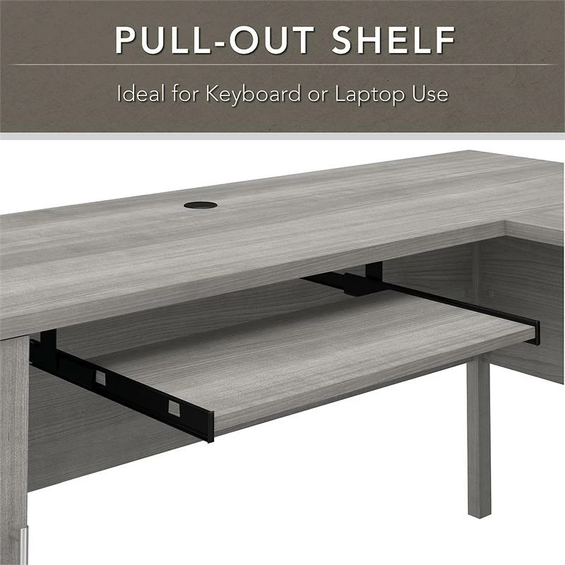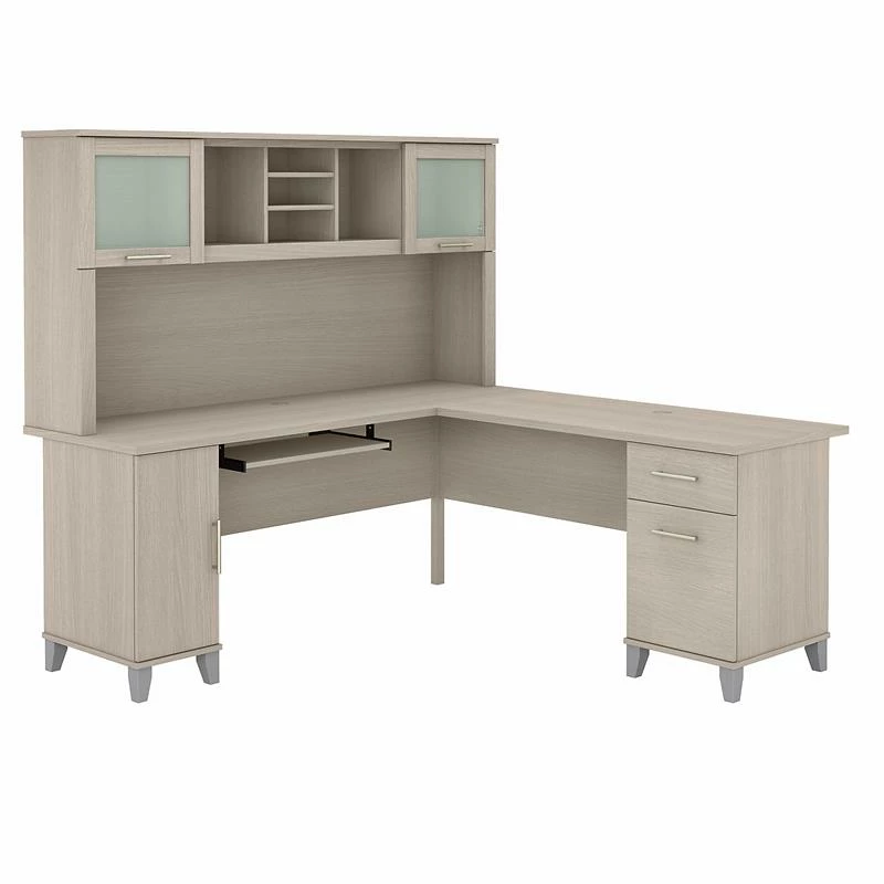 Maximize the potential of your home office with the Bush Furniture Somerset 72W L Shaped Desk with Hutch. Create your remote work headquarters with space for a computer, phone, printer and more. A convenient pull-out shelf provides a perfect place to keep a keyboard or laptop, while a storage cabinet and box drawer offer plenty of storage for supplies. A file drawer with smooth ball bearing slides allows for easy access to letter-size documents. Wire management slots help keep cords and cables in order. The Hutch features open storage with large compartments for books or decorations, two shelves to hold work-in-progress, and two frosted glass doors that provide concealed storage. This home office furniture set is tested to meet ANSI/SOHO standards for safety and performance and is backed by the Bush Furniture 6 Year Manufacturer’s Warranty. Material: Engineered Wood and Laminates.