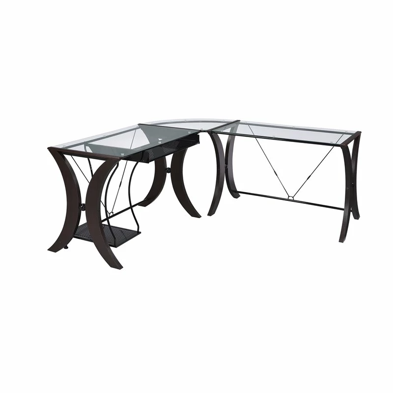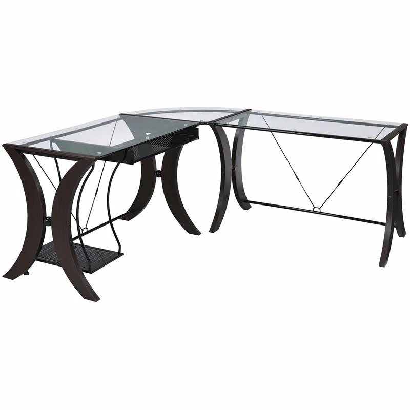 This contemporary style three-piece computer desk set has an L-shaped counter constructed with durable wood and metal frame finished in cappuccino and topped with clear tempered glass. This desk features a built-in CPU stand and keyboard drawer along with a shelf for CD slots.