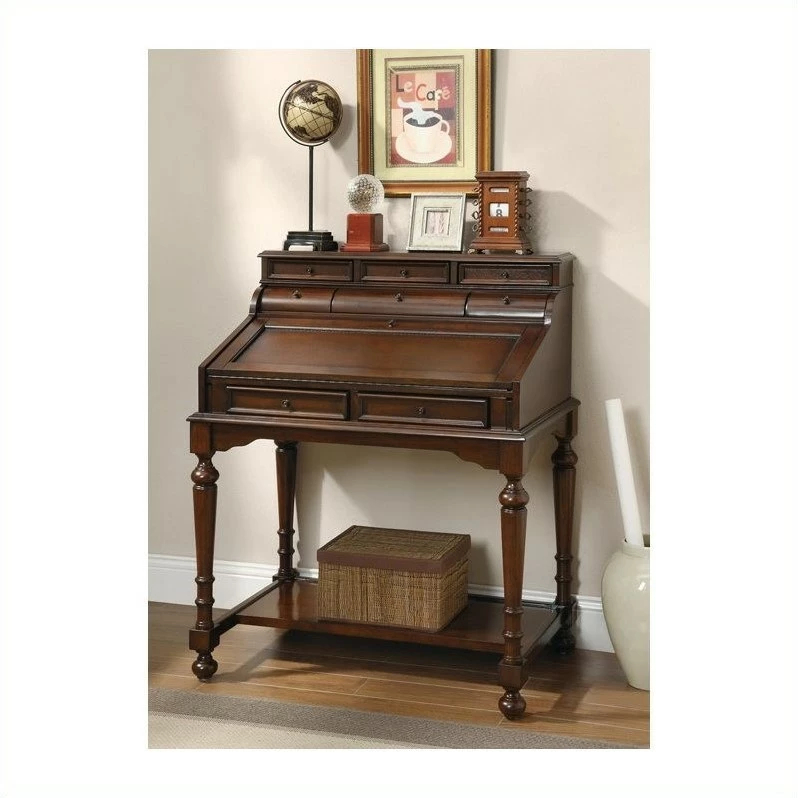 Add traditional style with functionality with this 10 drawer Pierce secretary desk from Stonecroft. The top opens up for extra use with your laptop and closes up for a tidy look. Turned legs add a traditional look but still durable and built to last. A spacious lower shelf and small storage drawers add additional storage to this beautiful piece.
