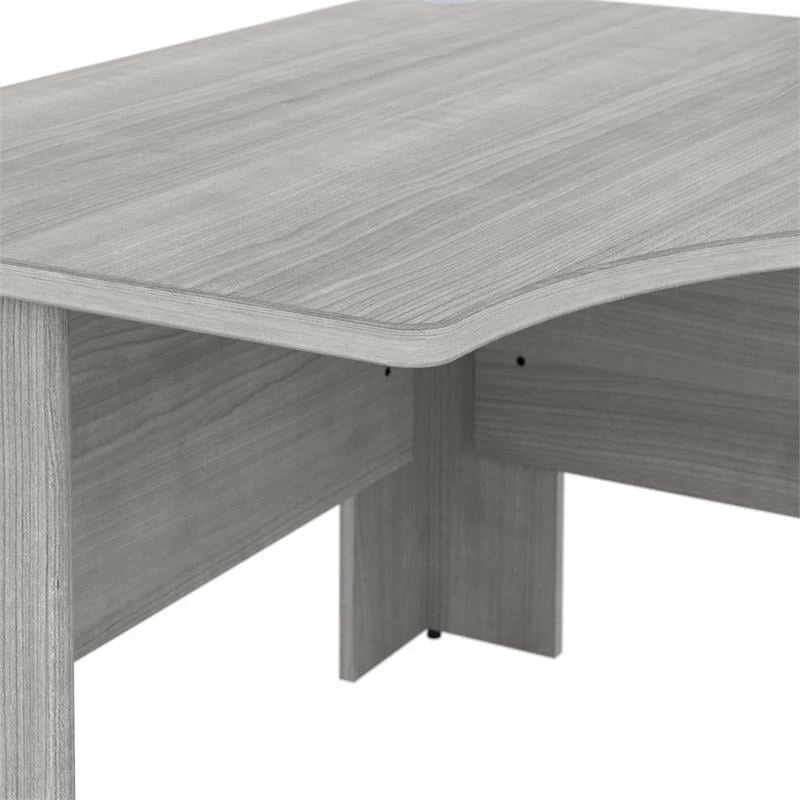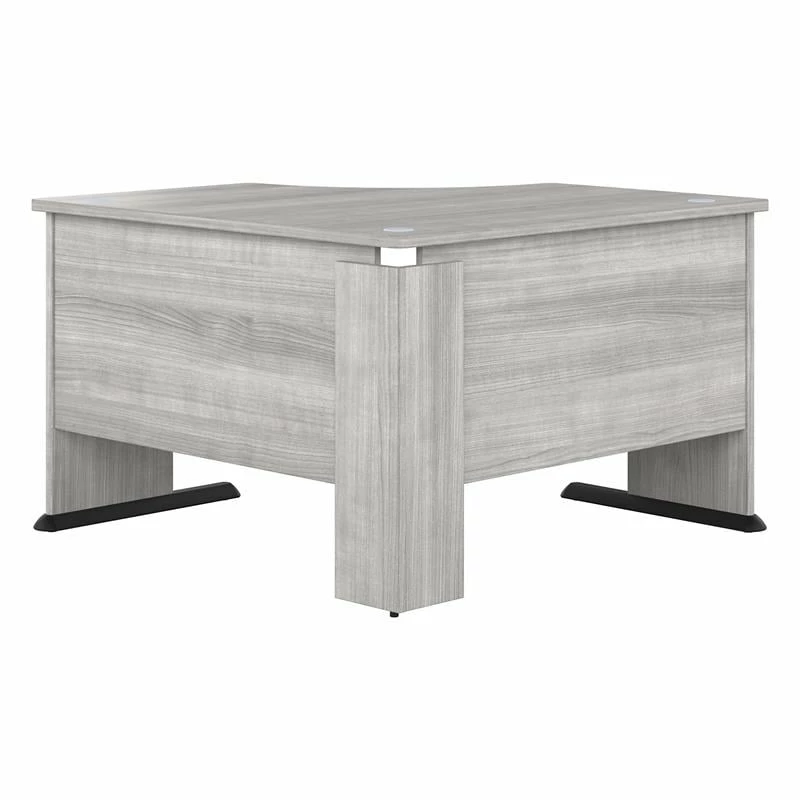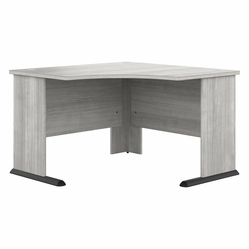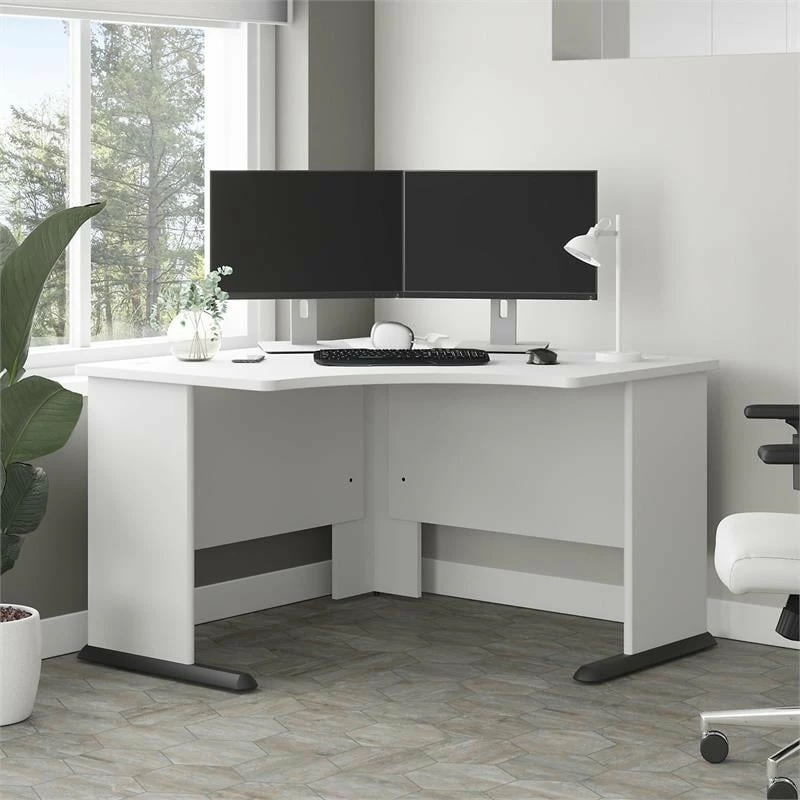 The Bush Business Furniture Studio A 48W Corner Computer Desk combines a fresh, contemporary appearance with the commercial quality construction needed to withstand years of everyday use. Conveniently designed to be placed in a corner of your choosing, this compact desk is a perfect choice for working or gaming where space is limited. Set up with a computer and equipment on a durable desktop that supports up to 200 pounds. A built-in wire management grommet keeps cords and cables in order so the surface remains free from unnecessary clutter. Wall attachment hardware is included along with the stable design for maximum safety and security in any home or professional office. This small corner desk has been meticulously tested to meet or exceed ANSI/BIFMA quality standards for safety, durability and performance and is backed by a 10 Year Warranty. American made with U.S. and imported parts.
