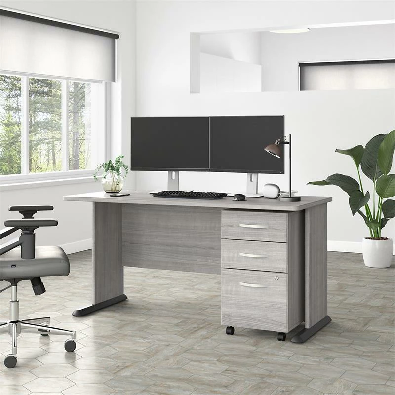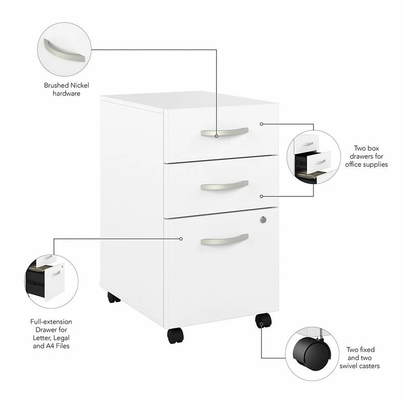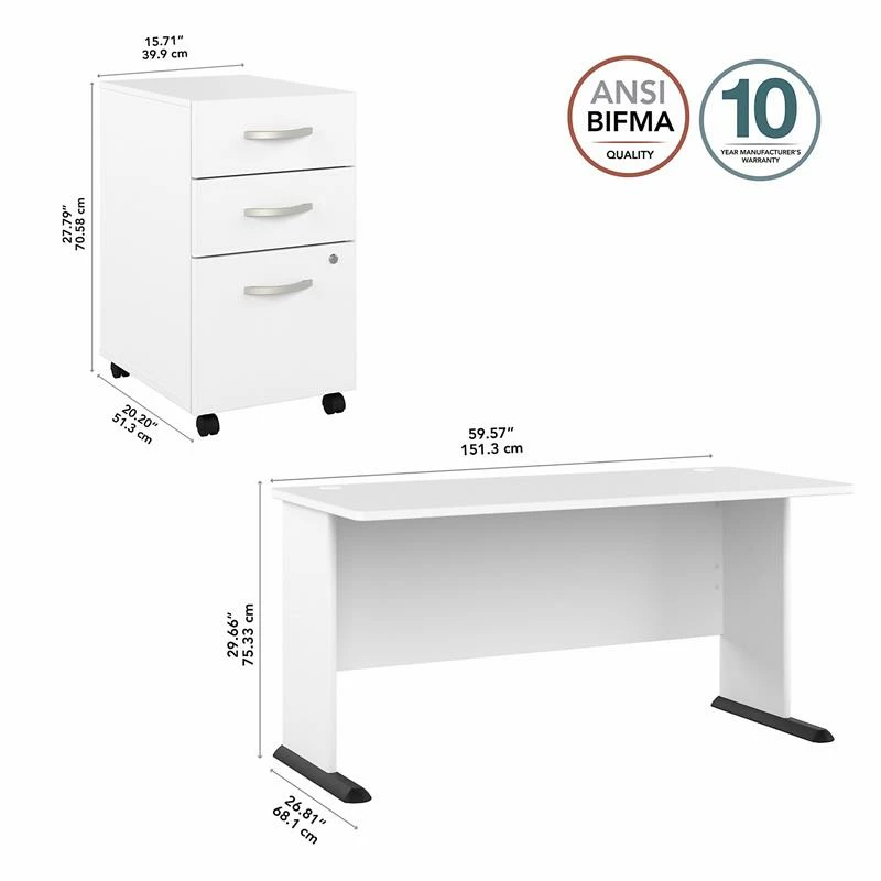 The Bush Business Furniture Studio A 60W Computer Desk with 3 Drawer Mobile File Cabinet combines a fresh, contemporary appearance with the commercial quality construction needed to withstand years of everyday use. Set up with a computer and equipment on a durable thermally fused laminate desktop that supports up to 200 pounds. Two built-in wire management grommets keep cords and cables in order so the surface remains free from unnecessary clutter. The filing cabinet’s bottom drawer accepts letter, legal and A4-size paperwork while a pair of box drawers organize supplies. The two bottom drawers can be locked to protect sensitive files and personal items. This office desk with drawers set has been meticulously tested to meet or exceed ANSI/BIFMA standards for safety, durability and performance and is backed by a 10 Year Manufacturer’s Warranty. American made with U.S. and imported parts.