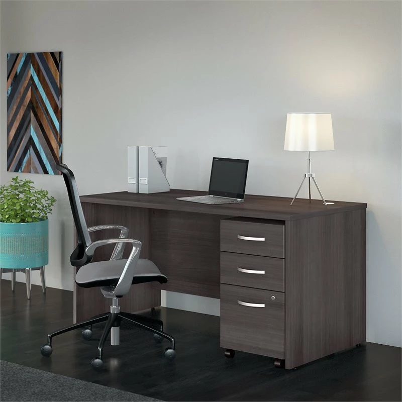 Choose the Bush Business Furniture Studio C 60W Office Desk with Mobile File Cabinet for a durable workspace that looks great and lasts for years. The thermally fused laminate finish, edge banding and end panels resist scratches, stains and dents while standing up to the rigors of a 40-plus hour work week. Keep computer cords out of your way with the cable management system for an organized work surface. The 3 Drawer File Cabinet rolls throughout your office or remains in place as needed. A full-extension file drawer opens on smooth ball bearing slides for an easy reach to letter, legal and A4-size paperwork while two box drawers organize supplies. A single lock secures the bottom drawers to protect sensitive documents and personal items. This desk with storage set comes with a 10 Year Warranty and meets ANSI/BIFMA quality test standards. American made with U.S. and imported parts.