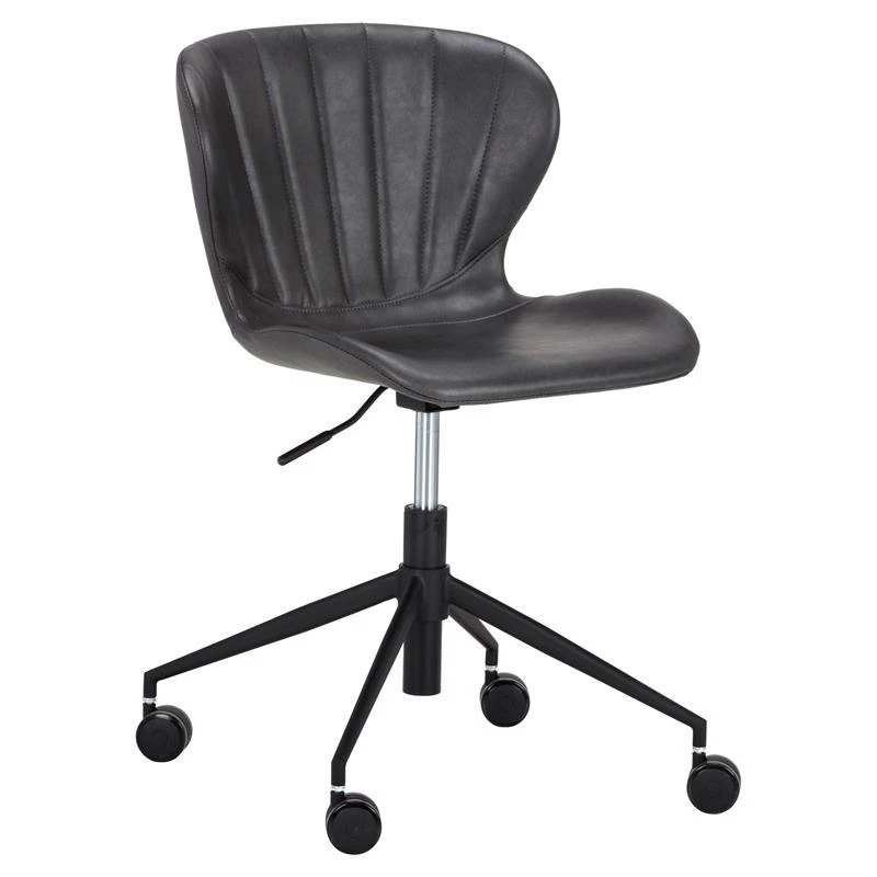 This swivel office chair is designed with charming yet sleek elements to offer an intriguing look for any office space. Features a clamshell seatback with channel tufting. Stocked in bravo cognac and portabella faux leather with black powder coated iron legs. Castors allow for easy mobility. Handle With Care: This design has been crafted with faux leather. Faux leather is manufactured to reflect the natural characteristics of leather; as such, colour variations, markings wrinkles, grooves, and light scratches are appreciated characteristics. No two pieces will be alike. Visit our Product Care page for more information on how to ensure the lasting beauty of this piece.