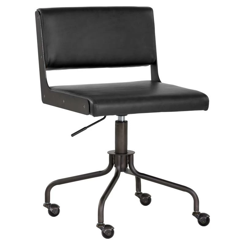 This armless office chair from our Urban Unity collection was inspired by Scandinavian style with an industrial flair. Stocked in rust tan and onyx faux leather and finished with an exposed brushed steel frame. Castors allow for easy mobility. Handle With Care: This design has been crafted with faux leather. Faux leather is manufactured to reflect the natural characteristics of leather; as such, colour variations, markings, wrinkles, grooves, and light scratches are appreciated characteristics. No two pieces will be alike. Visit our Product Care page for more information on how to ensure the lasting beauty of this piece.