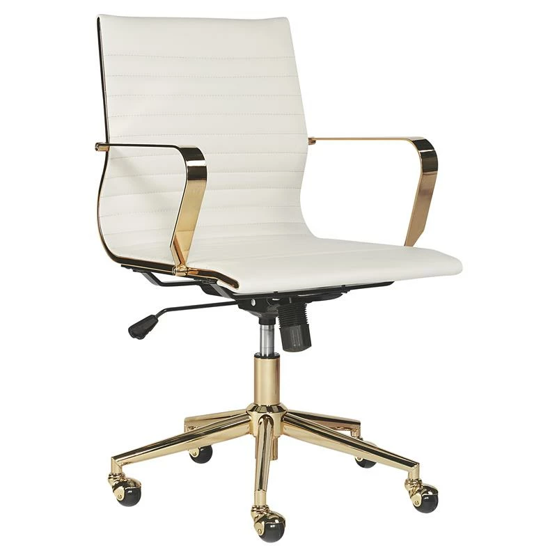 This office chair from our Urban Unity collection offers glamorous femininity. Features horizontal channel tufting on the seatback with a stunning polished gold steel frame and castors for mobility. Stocked in black and white faux leather. Handle With Care: This design has been crafted with faux leather. Faux leather is manufactured to reflect the natural characteristics of leather; as such, colour variations, markings, wrinkles, grooves, and light scratches are appreciated characteristics. No two pieces will be alike. Visit our Product Care page for more information on how to ensure the lasting beauty of this piece.