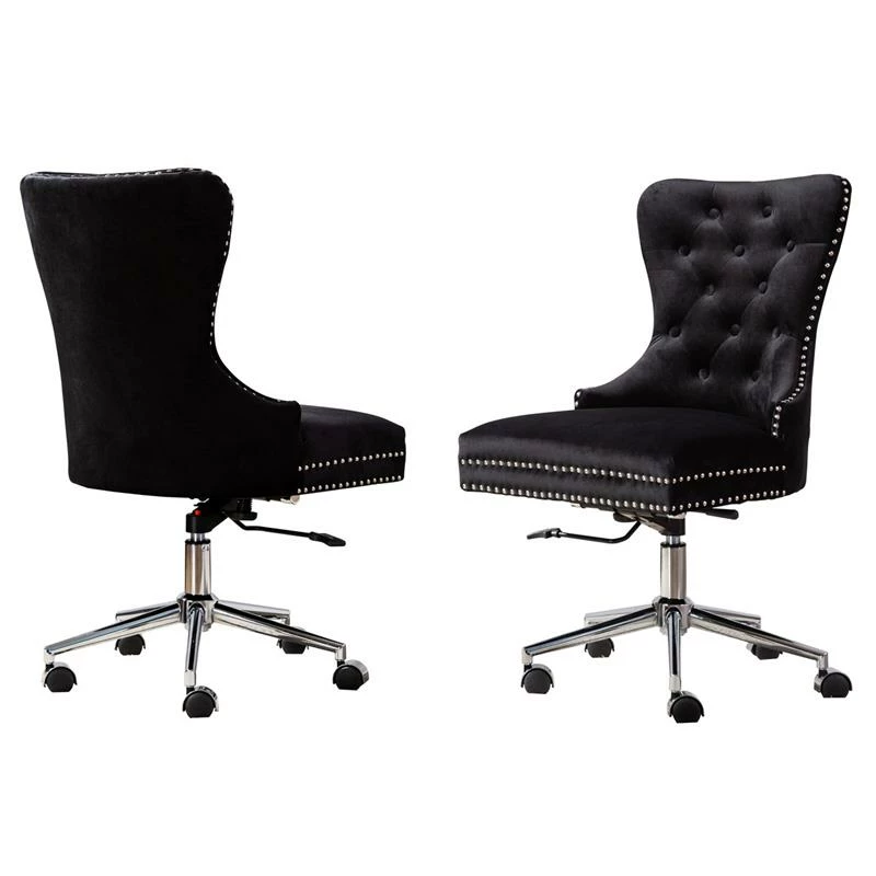 Office chair with tufted seats and silver legs. This chair also features a silver nailhead trim, adjustable height, and tilt locks. Available in colors: Dark Gray, Navy Blue, Black, and White Faux Leather. This office chair is also availabe with gold detailing instead of silver. Assembly required.