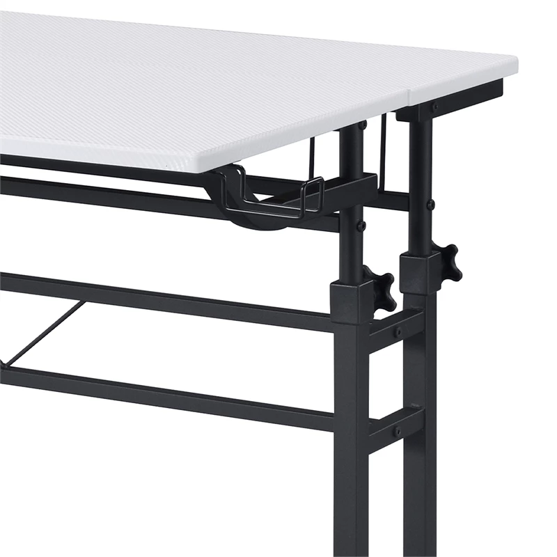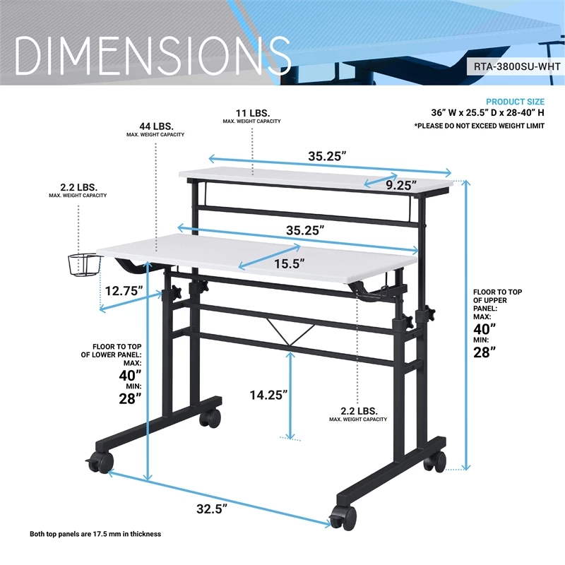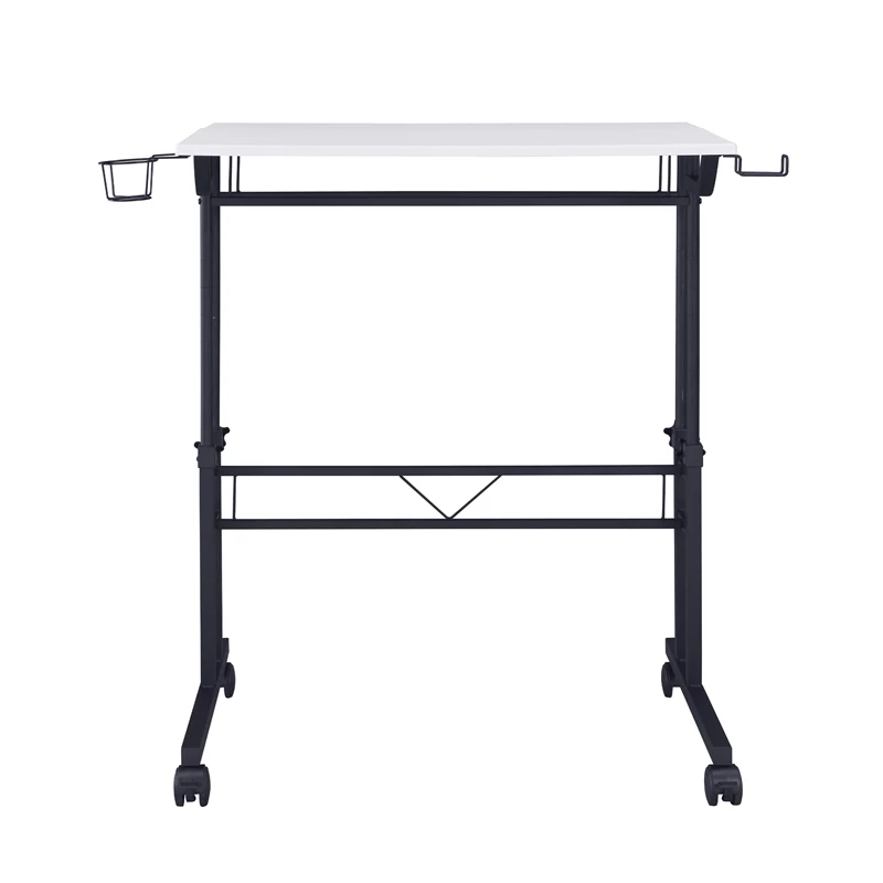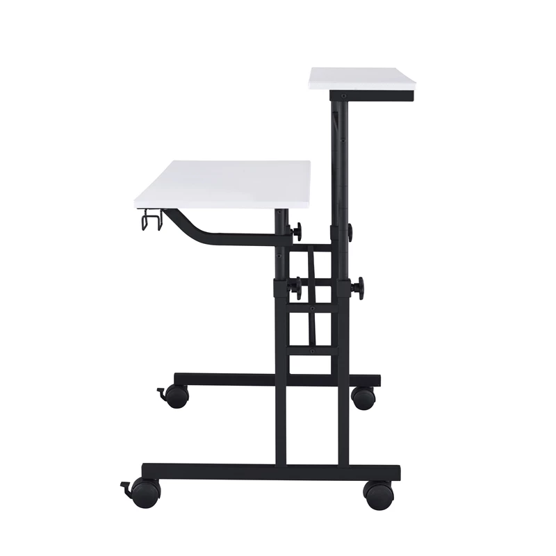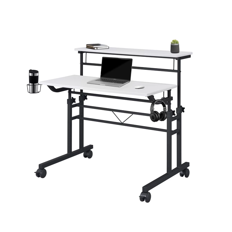 Mix industrial and modern styles together with this Techni Mobili Rolling and Adjustable Writing Desk. This desk is perfect for home-office spaces with its small footprint and offers option of 2 separate desktops independent levels with ample space that includes adjustable height mechanism. The finish coordinates with almost any decor while fiber-like texture tabletop surface and powder-coated metal frame and legs that give this desk a sturdy build along with a fun design. It includes front wheels with locking mechanism that let you swiftly glide in a home office space. The desktop is large enough to hold your laptop, notebooks, and office essentials while the other tabletop surface can be used as riser to keep items within reach. It comes with integrated headphone and cup holders that can be easily installed on right and left. It is easy to assemble, and comes with 5-year limited warranty.