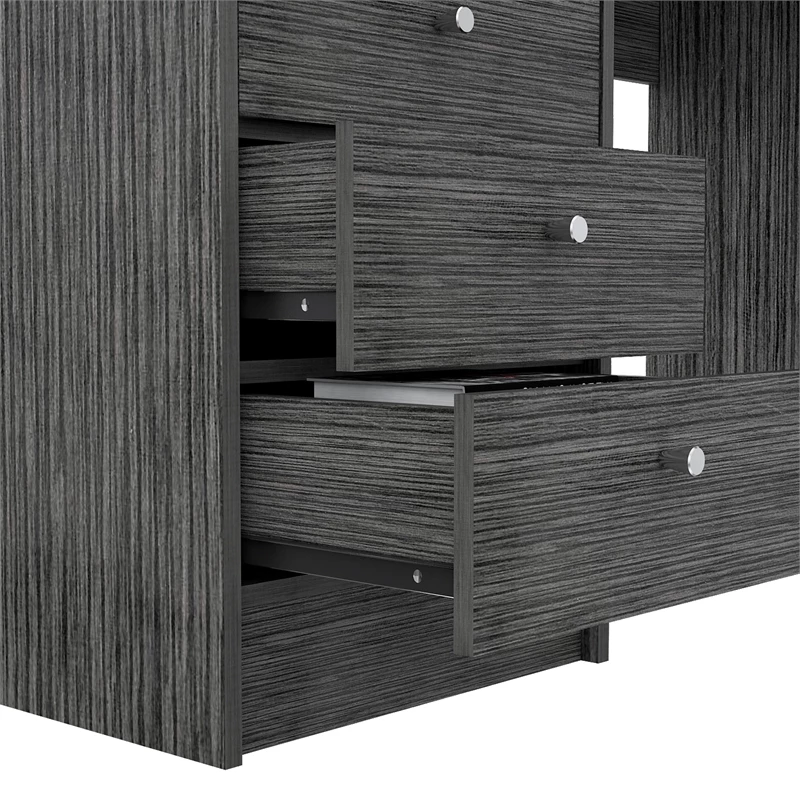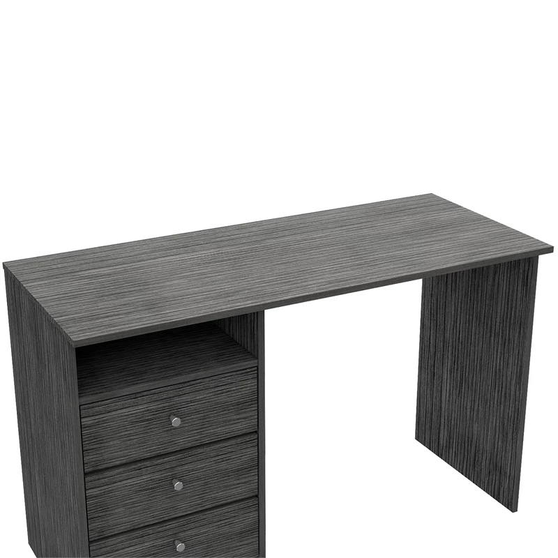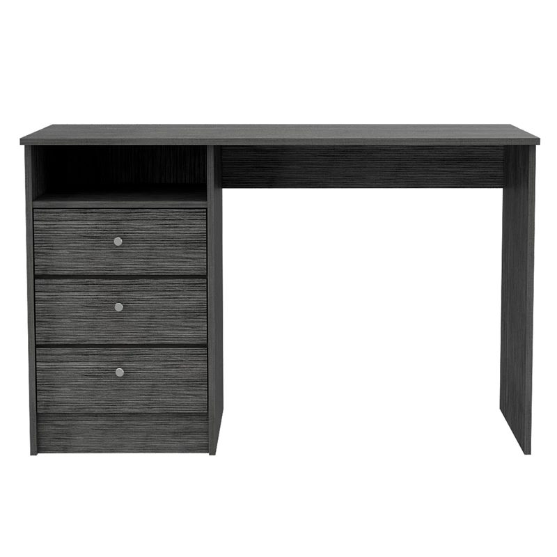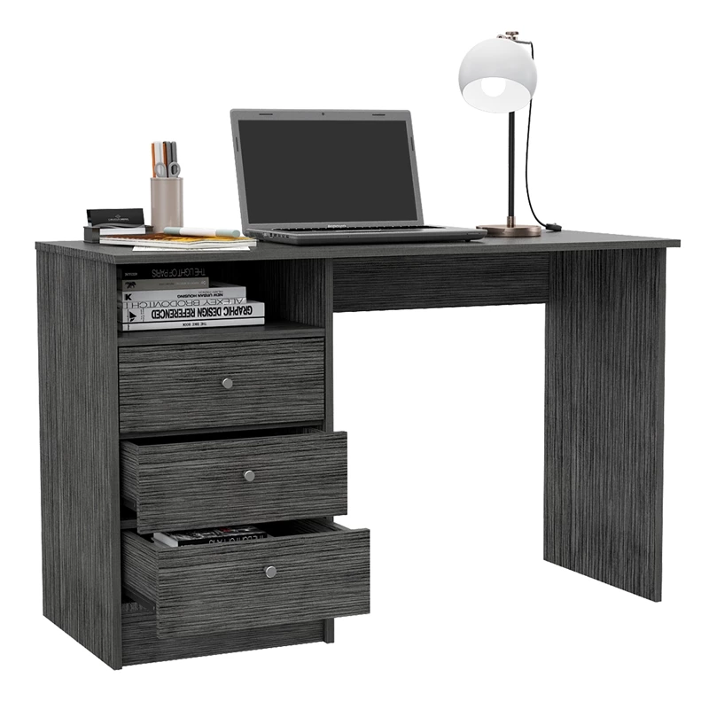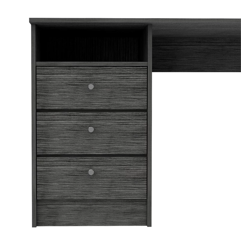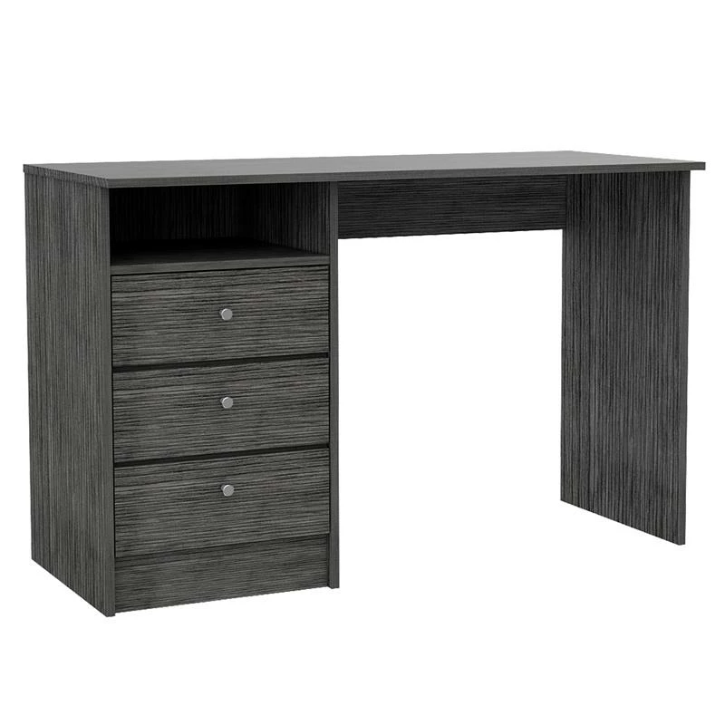 The Tuhome Charcoal Engineered Wood Andalucia Three Drawer Modern Computer is a modern pedestal desk, perfect for a home office or compact working area. The open hutch provides a space for quick storage and organization to maintain a clutter-free desktop. A clean and contemporary design with ample storage will compliment your style and maximize your space. Measurements: 46” x 19.5” x 29.5”H. Finish: smoky Oak, Gray.