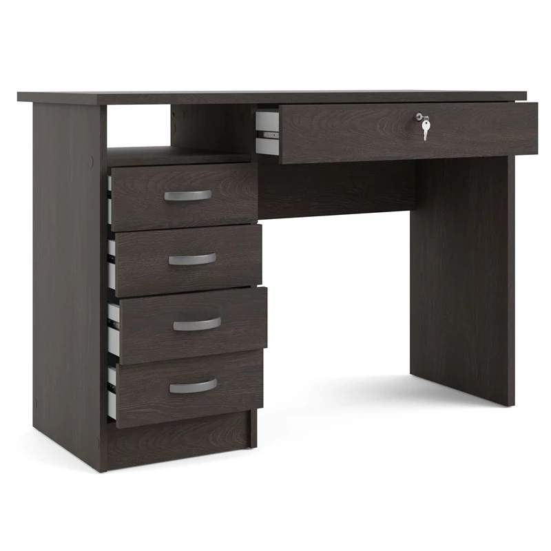 Office minimalist meets sophistication with the Walden Desk with 5 Drawers. This desk provides one open shelf for easily accessible items and the five drawers provide plenty of storage to assist with office clutter. The large drawer that sits directly under the desktop is lockable and provides storage for your keyboard, office supplies or important documents you want to keep locked up but within grasp. The drawers are backed with metal glides complemented with curved handles and the desk has a foil finish that provides durability and protects against stains, smears, and fading.