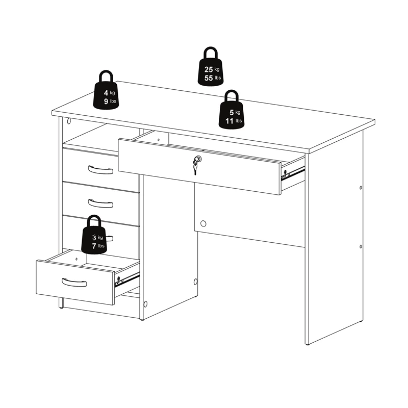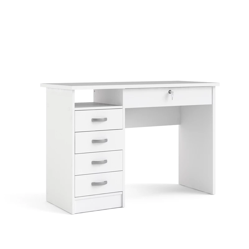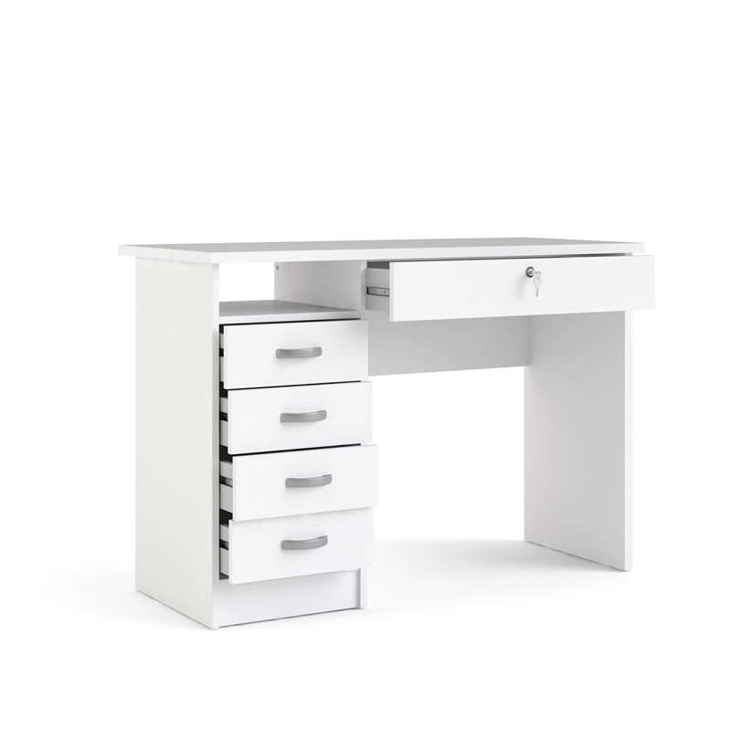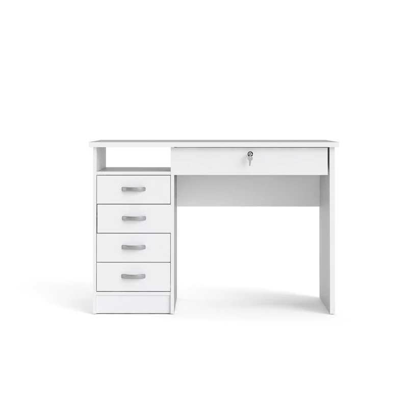 Office minimalist meets sophistication with the Walden Desk with 5 Drawers. This desk provides one open shelf for easily accessible items and the five drawers provide plenty of storage to assist with office clutter. The large drawer that sits directly under the desktop is lockable and provides storage for your keyboard, office supplies or important documents you want to keep locked up but within grasp. The drawers are backed with metal glides complemented with curved handles and the desk has a foil finish that provides durability and protects against stains, smears, and fading.