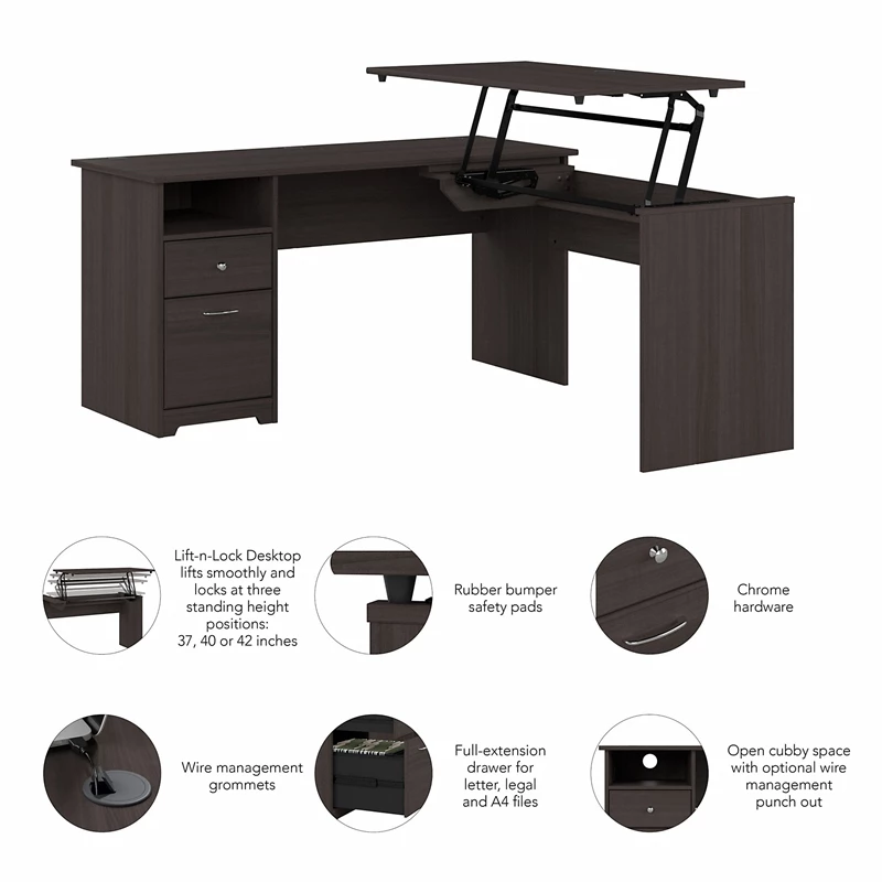 The UrbanPro 60W 3 Position Sit to Stand L Shaped Desk presents an ergonomic home office solution with transitional style. Enjoy the freedom to change positions throughout the day with a convenient Lift-n-Lock desktop that adjusts to three standing desk heights: 37, 40, and 42 inches from the floor. The adjustable desk surface supports up to 20 lbs. when extended so you can take materials with you while giving your back and neck a break from sedentary work. The fixed work surface features built-in wire management and has a weight capacity of 200 lbs. to accommodate multiple monitors and equipment. A file drawer, box drawer, and open cubby shelf keep all your documents and supplies organized and accessible. This ergonomic home office desk with storage has been rigorously tested to meet or exceed ANSI/SOHO standards for safety and performance and is backed by 1 Year Warranty.