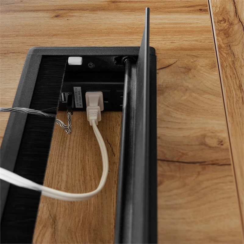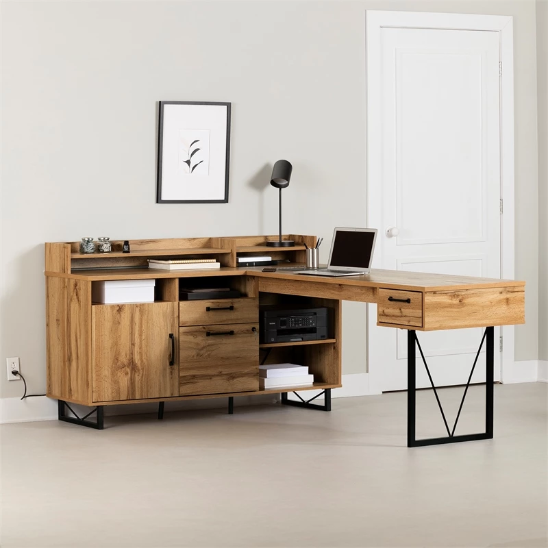 Treat yourself to a dream office, for your comfort and productivity when working at home. This L-shaped desk, with its modern Farmhouse style, is ideal for creating an inviting atmosphere in your professional space. The design is both rustic and minimalist, with its straight lines, asymmetrical compartments, and metal frame and handles. Place the desk whichever way you like, to make sure you have an attractive view while you work. The desk section is finished all around, so you can sit facing the window or in the center of your room. Put a trendy table lamp on your work surface – you can plug it directly into the built-in power strip, which contains two USB ports and two conventional outlets. You’ll have a setting that’s best for concentration!