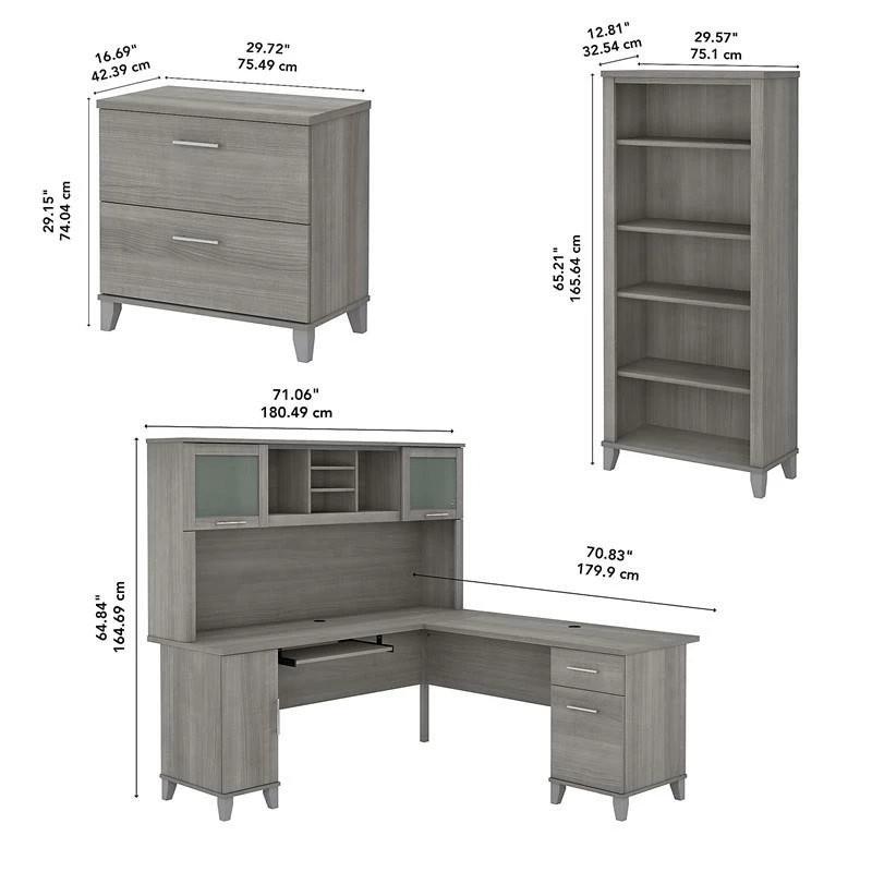 - Bundle includes: 72W L Shaped Desk with Storage, 72W Desk Hutch, 2 Drawer Lateral File Cabinet, 5 Shelf Bookcase