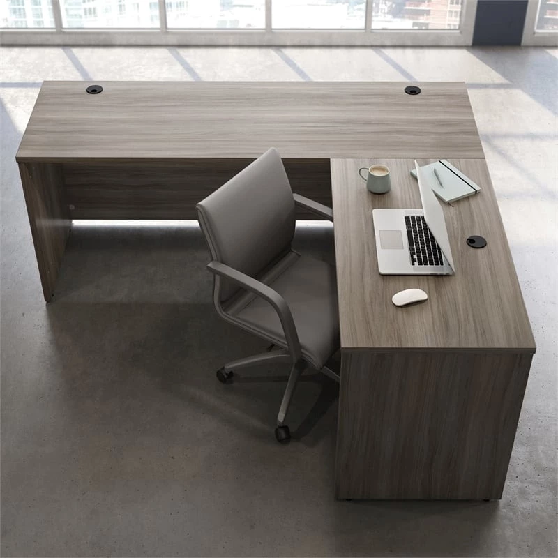 Looking to expand or add to a desk that you know and love? This desk return from the UrbanPro collection helps you design the ideal office space. This desk return can be fastened to the left or right side of other UrbanPro items: 427422 Desk 72″ x 24″, 427427 Desk 72″ x 30″, or 427468 UrbanPro Executive Desk 72″ x 36″. This desk return table is designed with a durable, 1″ thick top to allow extra space for your computer, lamp, or planner. The melamine top is designed for longevity with a heat, stain, and scratch-resistant surface, making it the ideal return for commercial desks. An executive desk with attached side desk provides extra workspace to enhance any office configuration. This left corner desk includes a cord management system with a desk top grommet hole to keep your electronic cords organized and prevent cord clutter. Adjustable base levellers are included on this computer desk return to ensure optimal office ergonomics and alignment with other products, especially over uneven flooring. Finished in Hudson Elm, this computer desk return will complete your office cubicle or any other workspace.