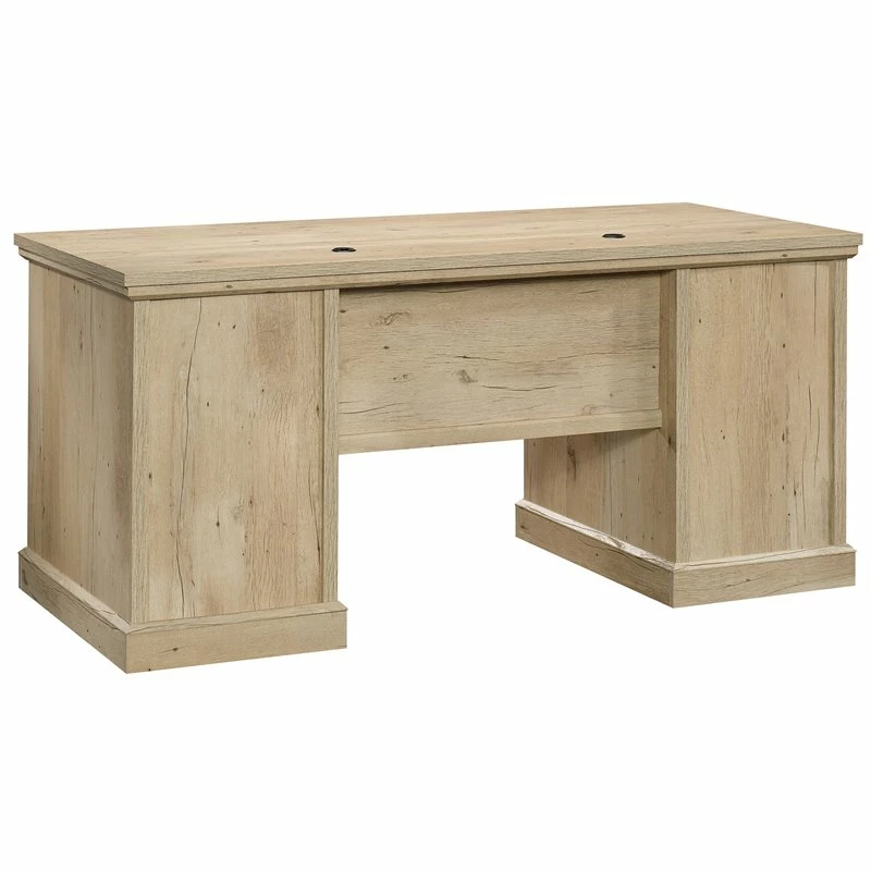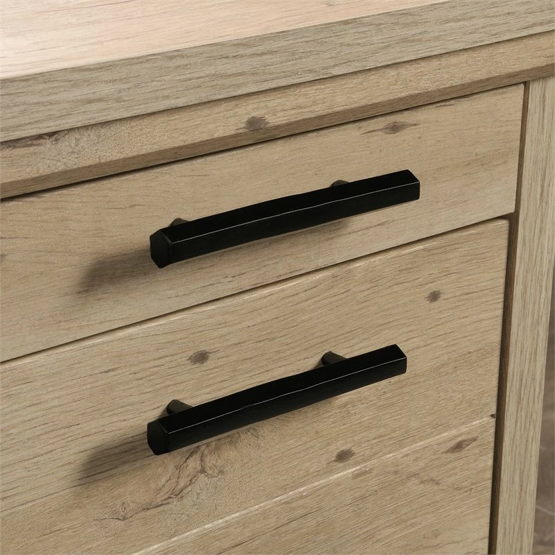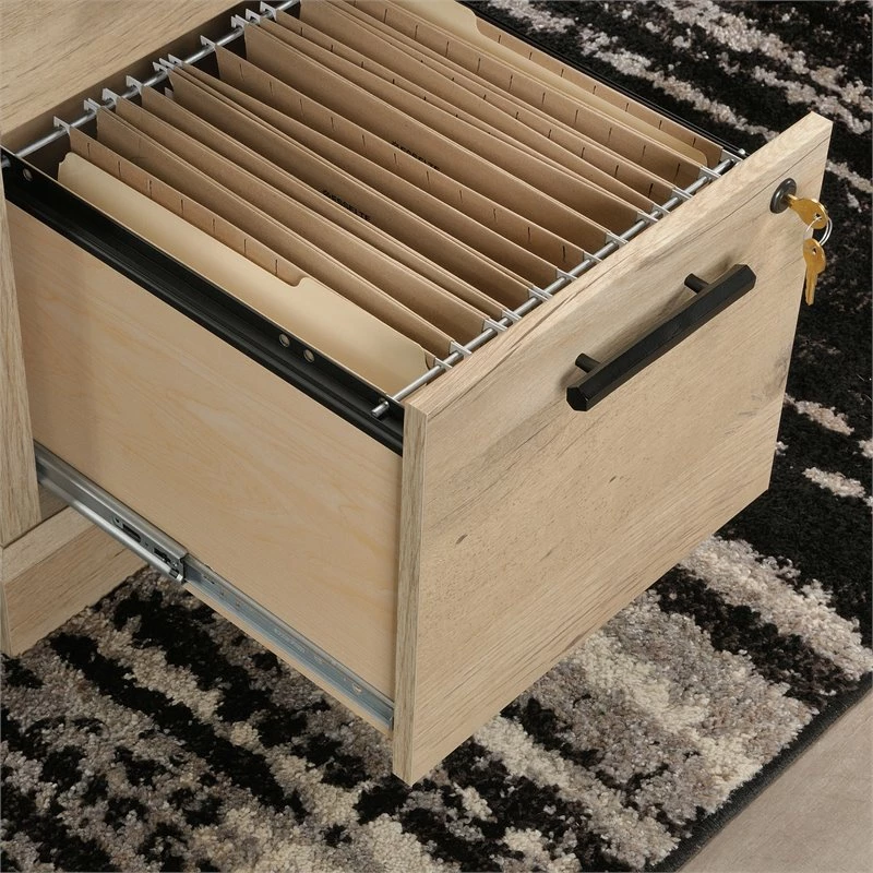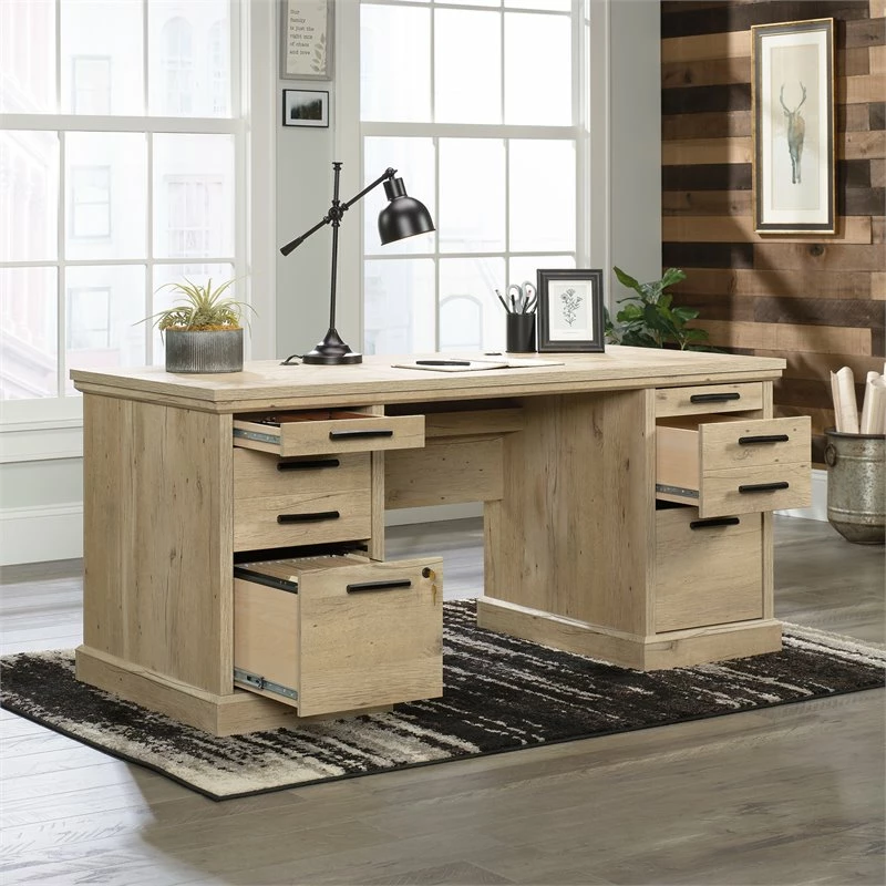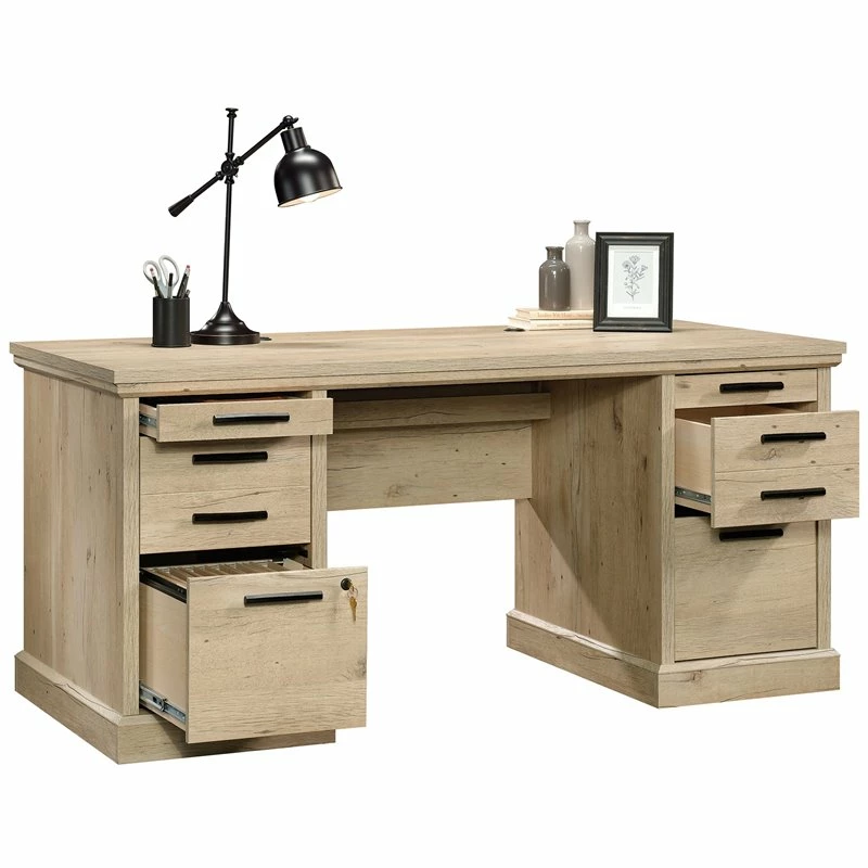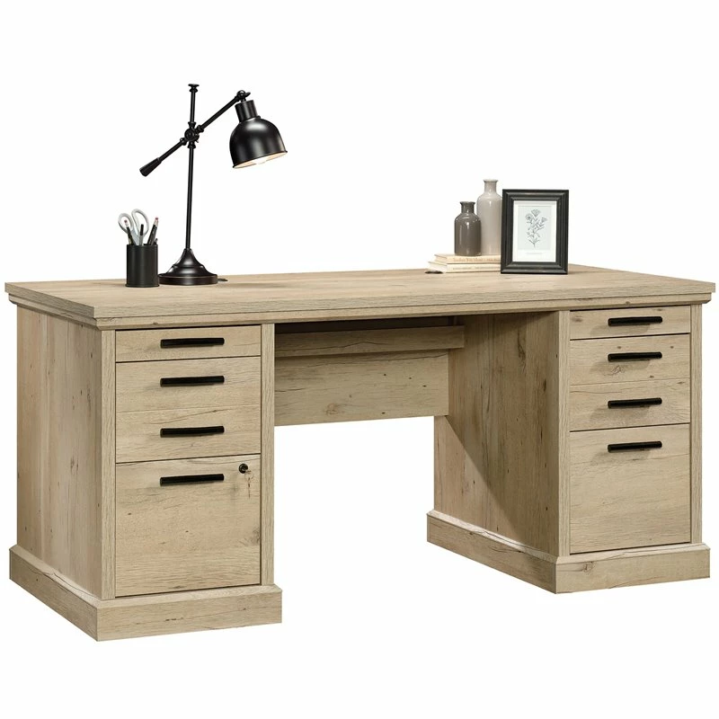 Desks have become an essential addition to the home. With the executive computer desk from the UrbanPro collection, style and function are combined into one grand desk. The top of this home office desk features strong and lightweight 1″ panel construction so you can trust it to support your books, while also being light enough to easily rearrange your home office. This computer desk with drawers features two smaller pencil drawers and two medium size storage drawers to hold spare paper, pencils, binders and more. Two lower file drawers with full extension slides hold letter, legal or European size hanging files so your most important documents are organized and easily available. The left file drawer also features a lock for security and peace of mind. This executive desk with storage features a cord management system with two desk top grommet holes to keep your cords tidy and out of sight. Featuring quick and easy assembly with patented T-lock drawer system, assembly and set up of this item will be a breeze. Finished in a light Prime Oak, this wood home office desk adds the ideal amount of stateliness and function to create the ultimate home office.