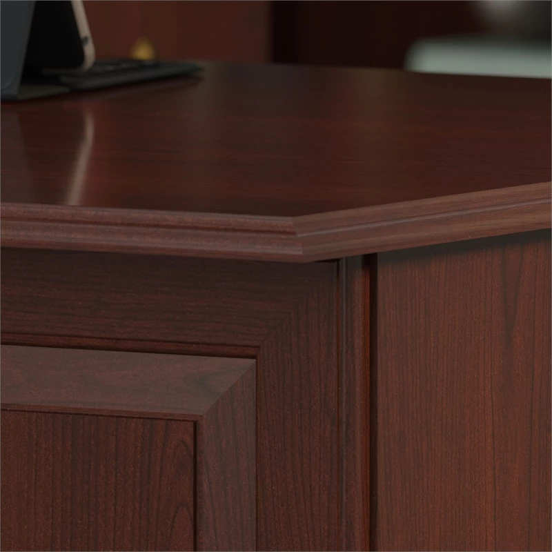 The UrbanPro L Shaped Computer Desk, Lateral File Cabinet and 5 Shelf Bookcases office set offers luxurious looks at a lasting value. Pen letters, pay bills or outfit your professional-grade home or private office with a traditional L Shaped Desk built for everyday use. The durable thermally fused laminate surface lasts for years while resisting scratches and stains to protect the warm Harvest Cherry finish. Enjoy all the workspace you need to multitask on the expansive L Shaped Desk, which can be assembled for left or right-handed users. Gold-finished Brass hardware and timeless design accents match the traditional styling of your home office or professional workspace. Not just for looks, the Computer Desk includes a wide retracting keyboard shelf and three full-extension file drawers, which open on smooth ball-bearing slides for easy access to contents. A pair of box drawers accommodate office supplies. The Lateral File Cabinet accepts letter, legal and A4-size files. A lockable upper drawer secures your most important paperwork, and the filing cabinet matches Desk height to extend your work surface. Each 5 Shelf Bookcase contains two fixed shelves for stability and three adjustable shelves. Move these shelves up or down to display books, photos, plants and reference materials of different heights. Equipped with a UrbanPro 10 Year Warranty, meets ANSI/BIFMA quality test standards. See the full collection of commercial office furniture. Materials: Engineered wood and Laminates