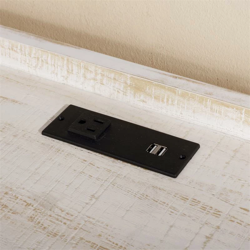 A mix of rustic and modern minimalist, this transitional wood and metal computer desk is the perfect focal point for a home workspace. Its designed with an antique white finish desktop with raised edges that keep everything in its place. A slim frame in a contrasting black finish adds light, airy style. The desktop is equipped with a USB outlet panel that creates the perfect place to keep your phone, tablet and Bluetooth accessories charged and ready for use.