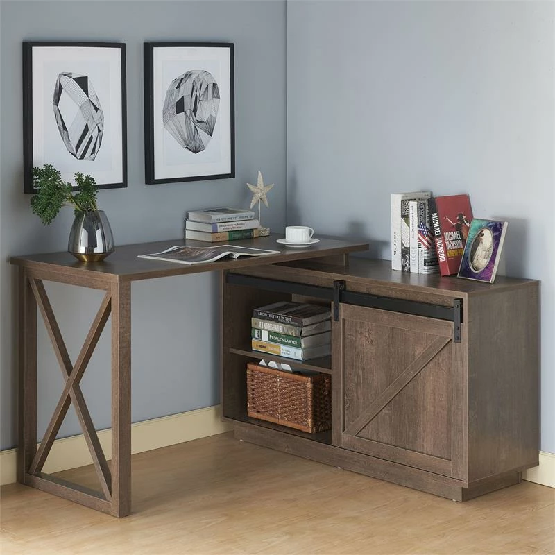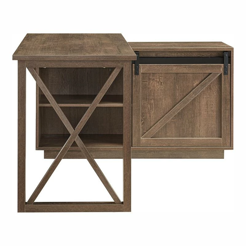This modern farmhouse walnut oak wood L-shaped desk is the perfect addition as you work or learn from home. Use as a workspace by day and as a vanity by night: store books, office essentials, makeup, and more within the cabinets, which feature a convenient barn style sliding door. Wood grain details and an X-cross accent supporting the desktop reinforce its farmhouse character.