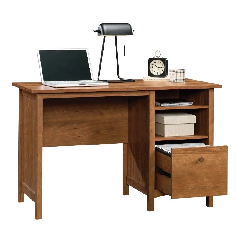 A simple desk that never goes out of style. This single pedestal desk from the UrbanPro collection will bring the basics back to the home office. This home office desk features a file drawer with full extension slides that holds all of your important letter-size hanging files. Or you could use it as a deep drawer for general storage. A convenient open storage area with an adjustable shelf allows you to customize the storage space of this computer desk with filing drawer to your liking. This open storage space is ideal for books, your planner, or small home décor items. Finished on all sides for versatile placement, this shaker style desk will look polished from every angle. Cord clutter is kept at bay with the cord management system including a desktop grommet. A warm Prairie Cherry finish makes this desk with open storage the latest and greatest addition to your home office.
