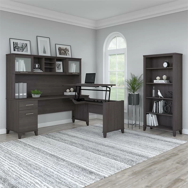- Bundle includes: 72W Office Desk with Drawers, 42W Sit to Stand Return, 72W Hutch, 5 Shelf Bookcase