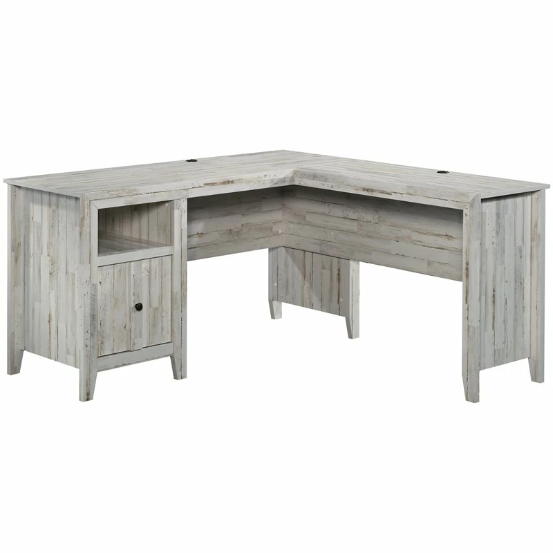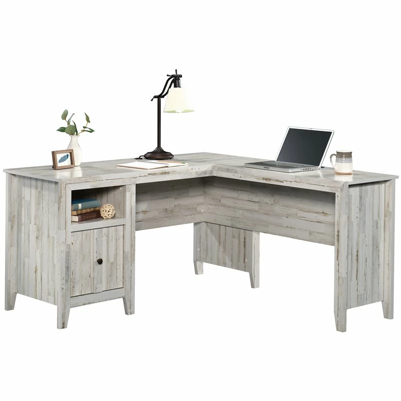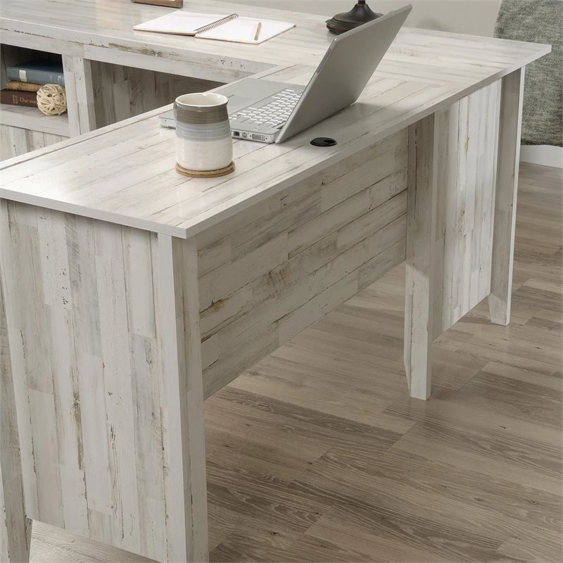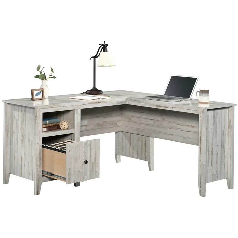 For a bright farmhouse office aesthetic, look no further than the L-shaped desk from the UrbanPro collection. This rustic L-shaped desk features a file drawer with full extension slides that holds letter-size hanging files. No longer will you have to dig through a messy drawer to find that tax return or instruction booklet. An open shelf allows for additional storage of books, folders, or some home décor. Cord management of this L-shaped home office desk includes two desktop grommets, so your cords remain tidy and your desk is clutter free. Finished on all sides for versatile placement in any room of your home, this farmhouse desk looks polished from every angle. Quick and easy assembly with a T-lock drawer system and slide-on moldings ensure your L-shaped desk with storage is assembled in a breeze. Finished in White Plank, this L-shaped desk will transform any home office from drab to fab.