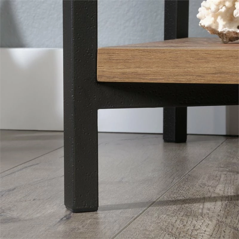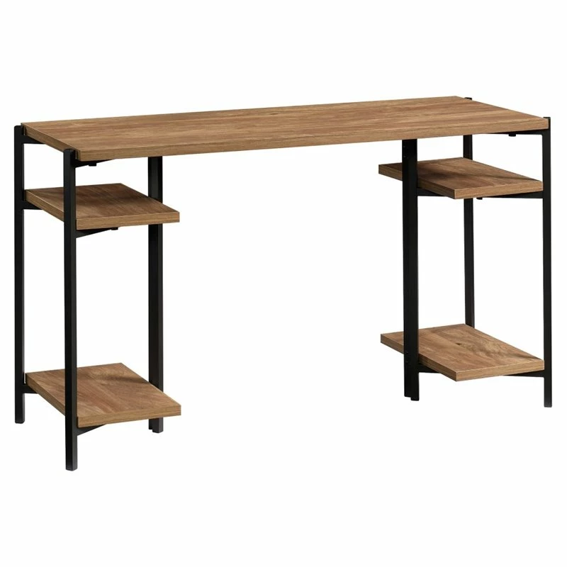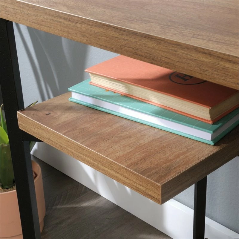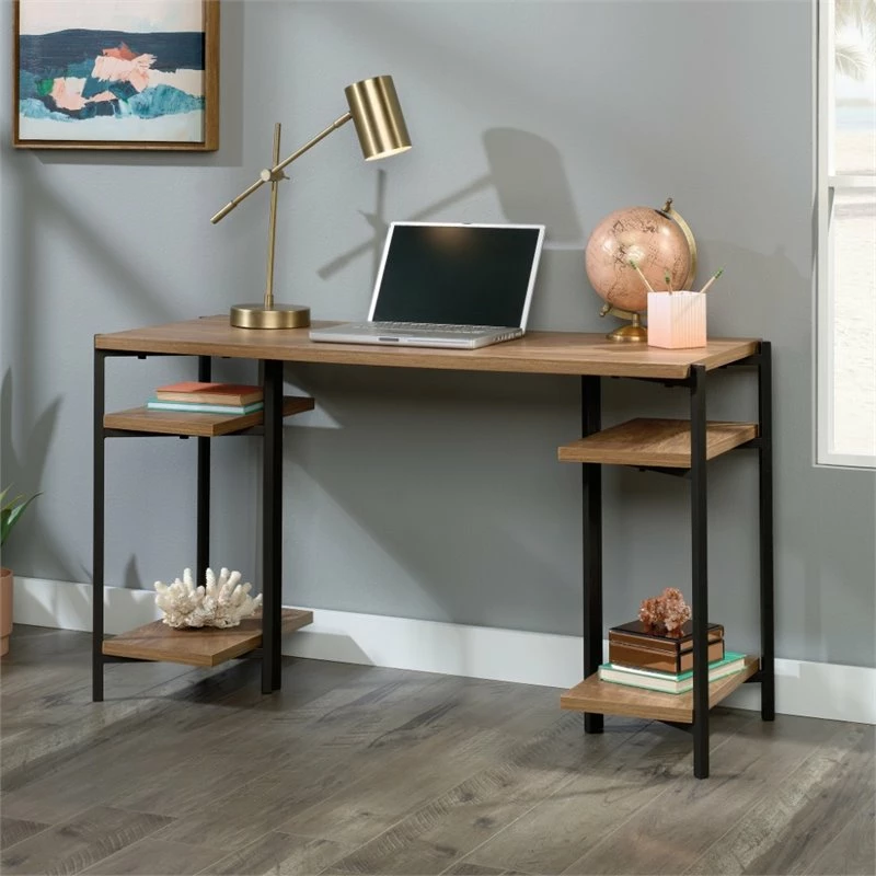 Working from home never looked better. Update your home office space with the industrial-inspired style and design of this computer desk from the UrbanPro collection! This home office desk features a sturdy, 1” thick top and shelves. Its spacious top surface provides you with room for all your desk essentials like your laptop, stacks of folders, your collection of notepads and a hot cup of coffee too. The open shelves offer a convenient space to easily store binders and folders or display home décor like decorative plants and framed photos. It has a place for all your things. This desk with open shelves offers simple assembly that requires no tools. It is finished on all sides so it will look the part no matter where it stands in your home. Finished in Sindoori Mango and detailed with a durable, black metal frame, this attractive open shelf desk gives your home the style you want with the functionality that you need.