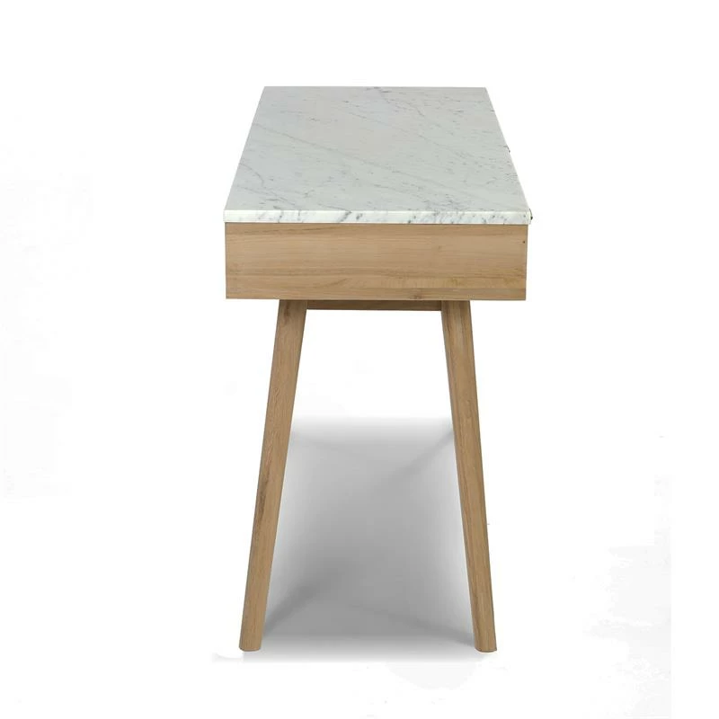 Versatile for many functions and rooms, this writing desk can be used as a laptop workspace, large console table, or vanity. Its compact shape easily accents a living room, bedroom, study, entryway, home office, or kitchen. Two wide drawers provide storage to hide away your accessories and clutter. The desk base and legs come in four different neutral wood finishes paired with a classy white and grey marble to elevate and add style to any space.