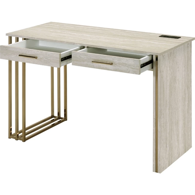 Bring contemporary inspired style to your home or office with this elegant Writing Desk. It features a wide rectangular top with 2 drawers that provide additional storage capacity can keep pens, notebooks, and chargers close by. The high gloss finish chrome sawhorse legs bring a modern touch to your home or office.